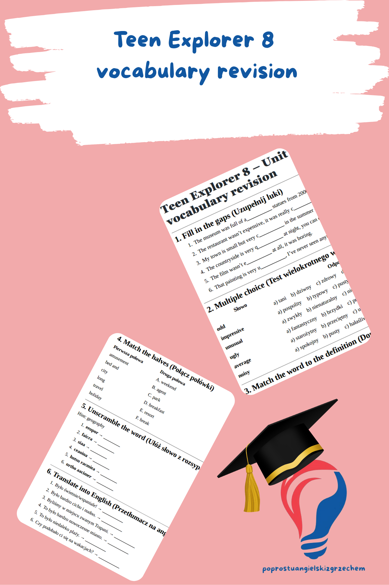 Dziesięć zadań na słownictwo do działu pierwszego z podręcznika Teen Explorer 8. Słownictwo z działu pierwszego w postaci karty pracy tutaj, w postaci testów tutaj, a w postaci krzyżówek tutaj. Niniejsze zadania możesz wykorzystać do przeprowadzenia powtórki, kartkówki lub do utrwalenia materiału ze słownictwa.