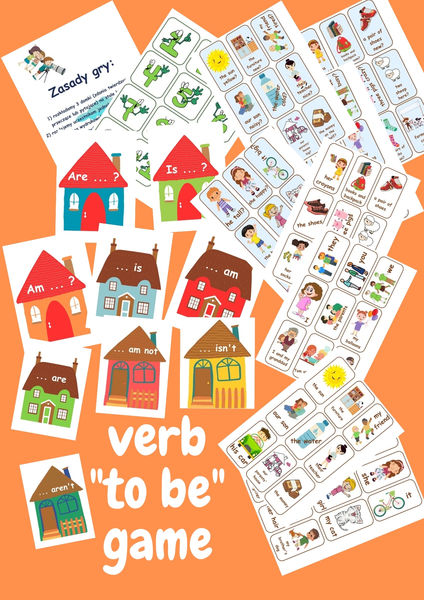 Kolorowa gra edukacyjna, która w prosty i angażujący sposób pomaga dzieciom opanować czasownik „to be” w zdaniach twierdzących, przeczących i pytających. Idealna na zajęcia indywidualne i grupowe – uczy poprawnej budowy zdań, rozwija refleks i motywuje do nauki poprzez rywalizację. Gotowy materiał do druku, który oszczędza Twój czas i uatrakcyjnia lekcje języka angielskiego.