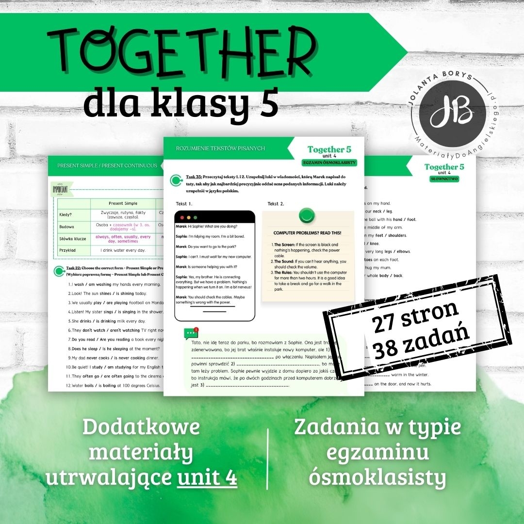 📖 Zestaw ćwiczeń do działu 4 podręcznika Together 5 to doskonałe uzupełnienie lekcji – idealne do pracy na lekcjach w szkole, zajęciach dodatkowych, korepetycjach, samodzielnej nauki lub jako dodatkowe zadania dla chętnych.