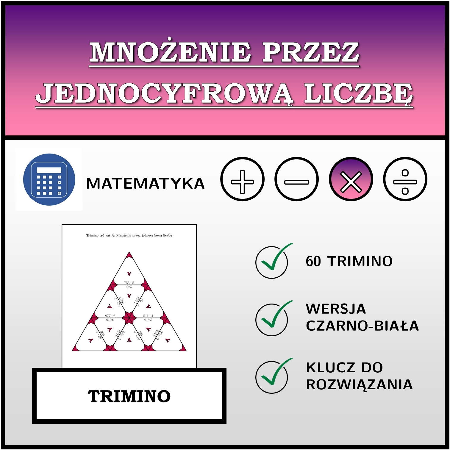 W materiale znajduje się łącznie 60 różnych zestawów trimino na temat mnożenie przez jednocyfrową liczbę w następującym układzie: