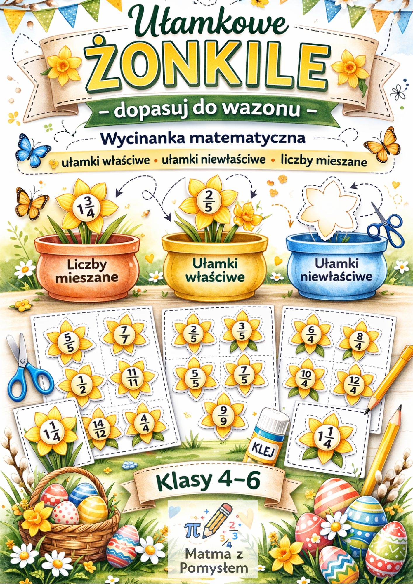 👉 Wiosenna wycinanka matematyczna do nauki ułamków – uczniowie dopasowują żonkile do odpowiednich wazonów, utrwalając podział na ułamki właściwe, niewłaściwe oraz liczby mieszane. Idealna na pierwszy dzień wiosny, lekcje i powtórki 🌼