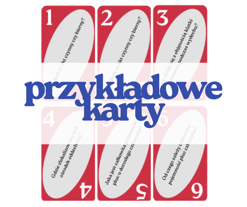 Gra typu Uno zawierająca pytania z zakresu układu oddechowego, układu krążenia i odporności - poziom rozszerzony (matura). Grę można wydrukować drustronnie - na odwrocie znajdują się odpowiedzi - jednak różnice w ustawieniach drukarek mogą powodować przesunięcie tylnej strony względem przedniej. Polecam karty drukować jednostronnie, a odwroty wykorzystywać  jedynie jako klucz dla nauczyciela (: Karty nadają się do wydrukowania i zalaminowania, dzięki czemu posłużą niejednokrotnie.