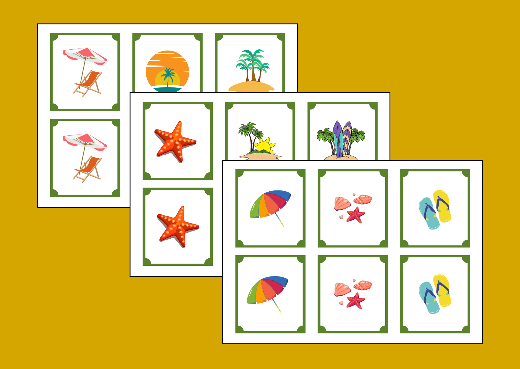 Gra memory uczy dzieci skupienia i koncentracji. Proponuję memory z ilustracjami związanymi w wakacjami (6 stron na każdej po 6 ikonek). Po wycięciu materiał można zalaminować, aby dłużej służył.