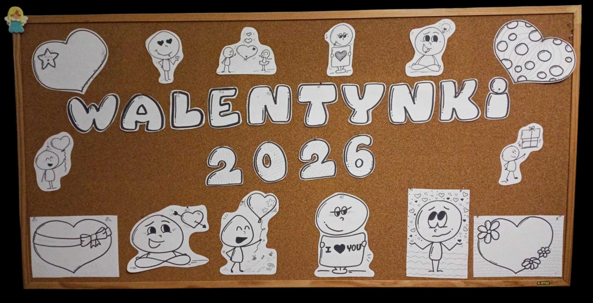 - Postacie walentynkowych ludzików — urocze, czarno-białe ilustracje, które dodają humoru i lekkości każdej dekoracji.