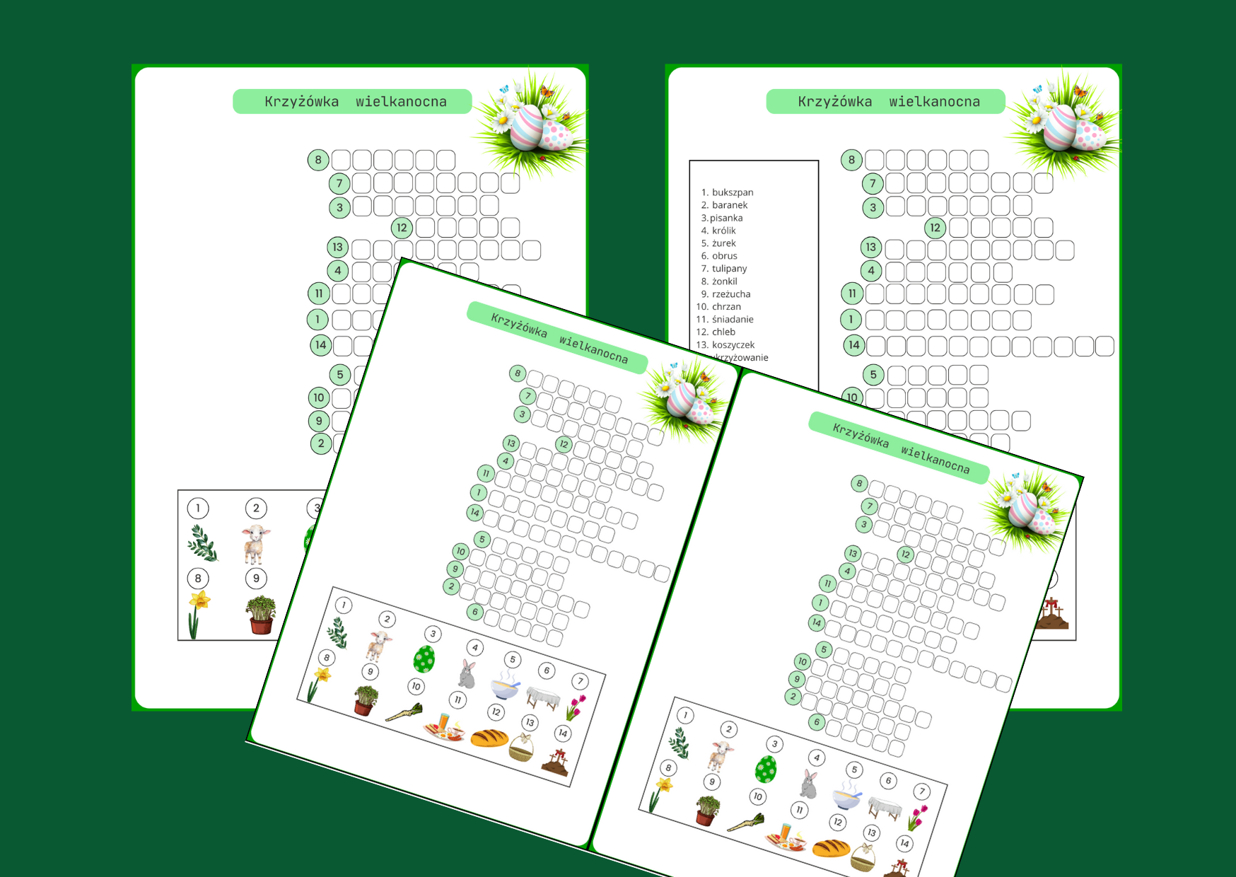 Krzyżówka obrazkowa dotycząca wyrazów związanych z Wielkanocą. Po rozwiązaniu wpisane słowa można wykorzystać np. do ćwiczeń ortograficznych lub redakcyjnych.