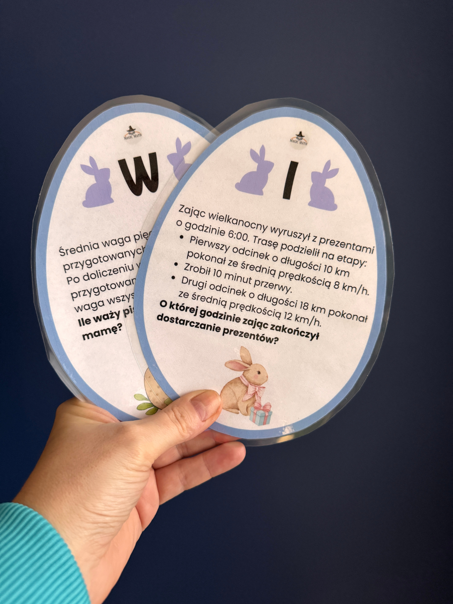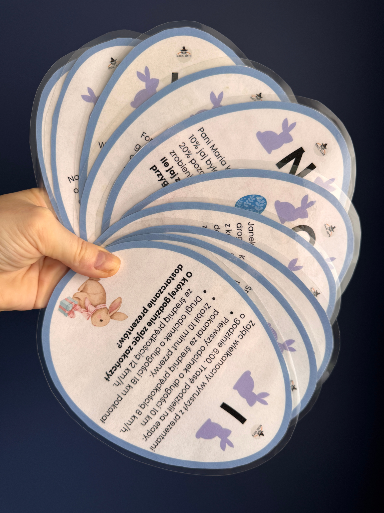 Uczniowie wchodzą do klasy, a na ławkach, pod krzesłami albo na tablicy ukryte są… pisanki z zadaniami matematycznymi. Zamiast zwykłej karty pracy zaczyna się wielkanocne szukanie jajek :)