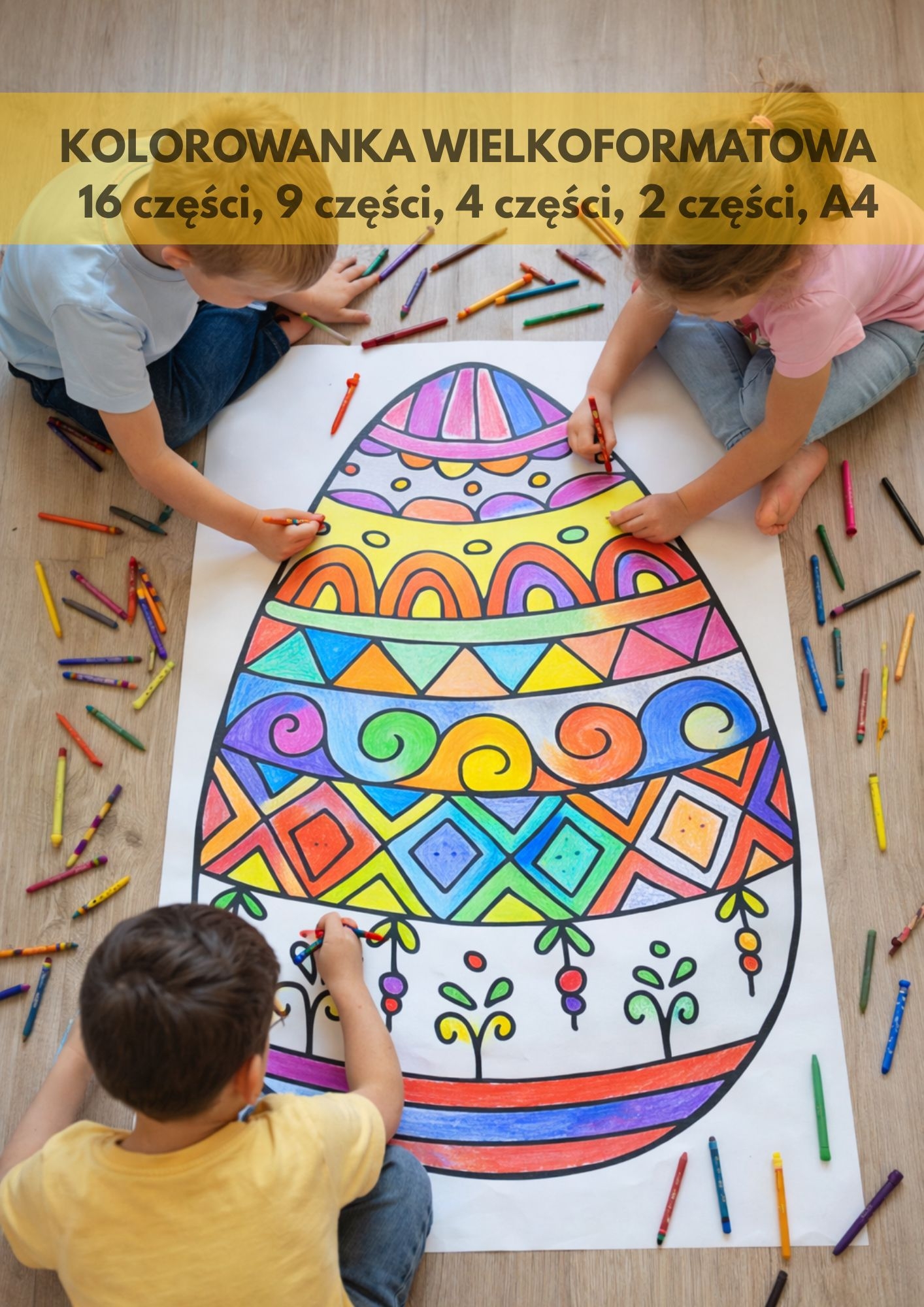 Po wydrukowaniu i połączeniu stron powstaje duży plakat do wspólnego kolorowania. Dzieci mogą rozłożyć go na podłodze lub na stole i razem tworzyć kolorową, wielkanocną pracę. To doskonała okazja do rozwijania kreatywności, współpracy oraz integracji w grupie.