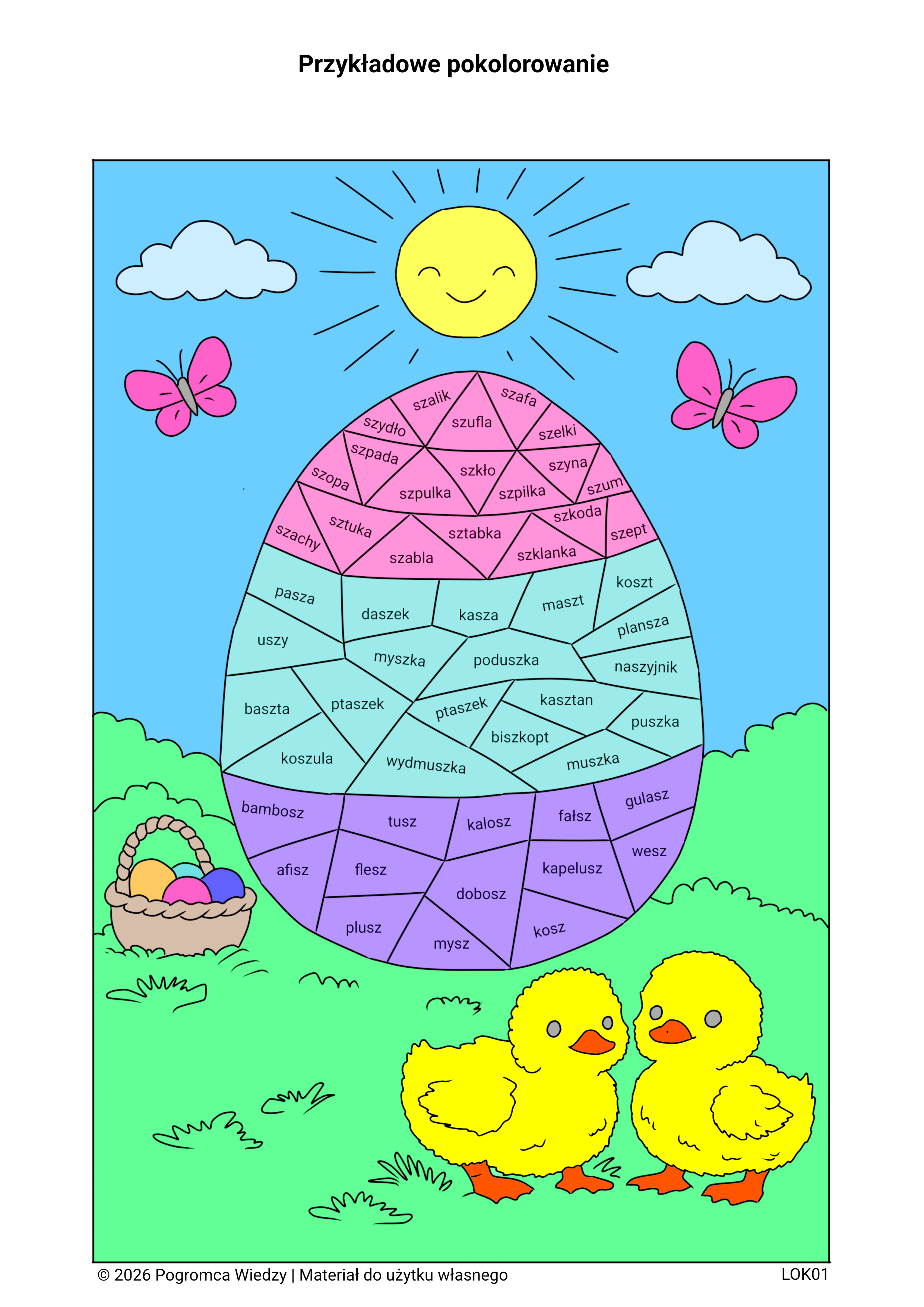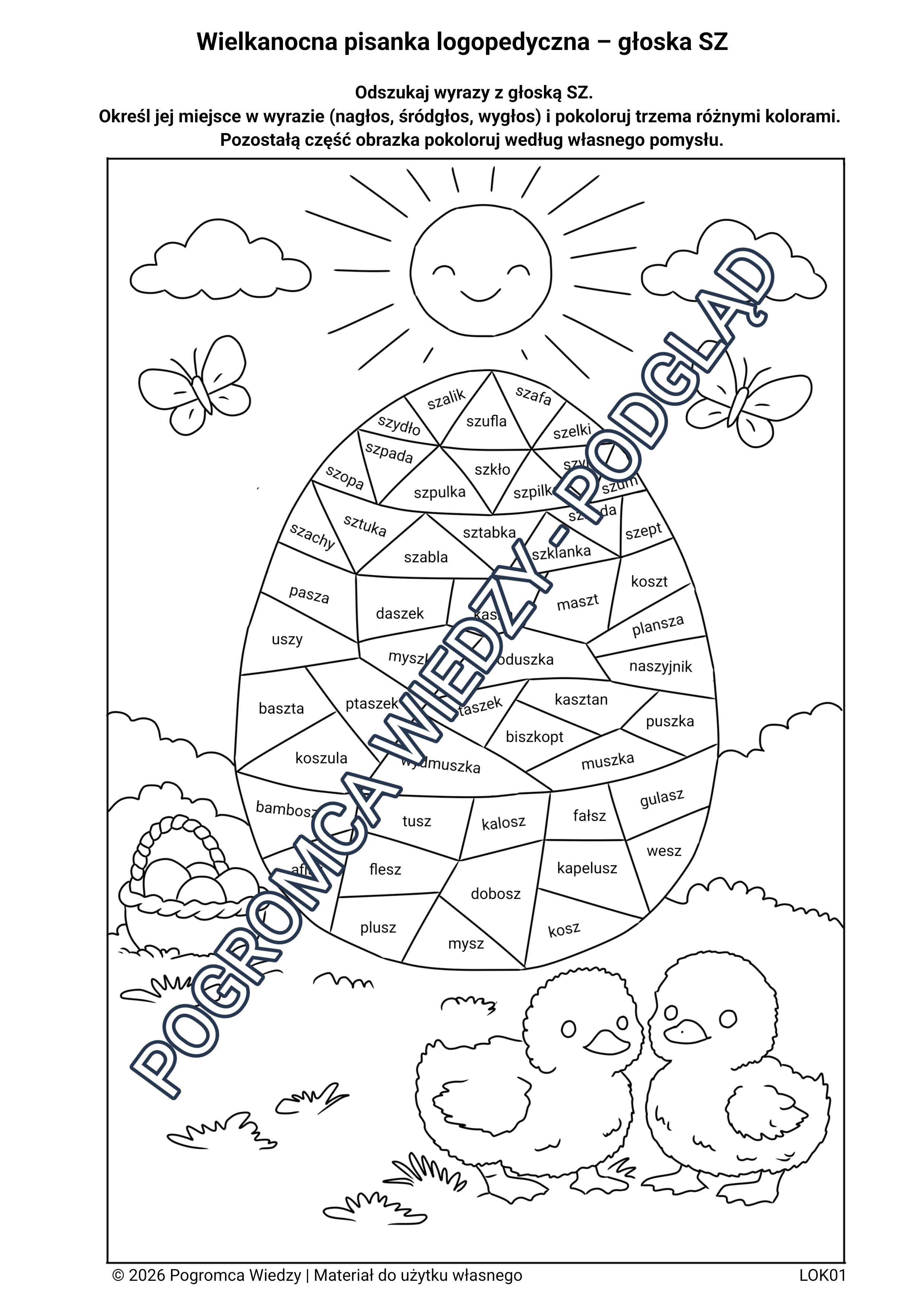 *Wielkanocna karta pracy do ćwiczeń głoski SZ w atrakcyjnej formie pisanki. Uczeń wyszukuje wyrazy, określa miejsce głoski w wyrazie (nagłos, śródgłos, wygłos) i koloruje według kodu. Połączenie nauki z kreatywną zabawą sprawia, że dzieci chętnie angażują się w ćwiczenia i utrwalają materiał w przyjemny sposób. Materiał zawiera klucz odpowiedzi, co ułatwia sprawdzanie i pracę z uczniem. Kontakt: pogromcawiedzy@gmail.com