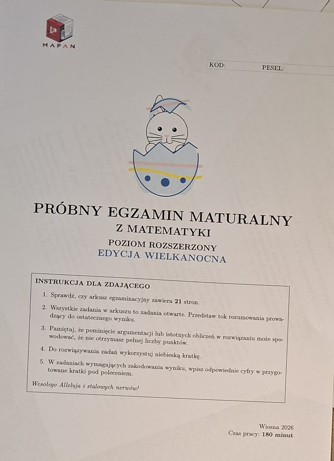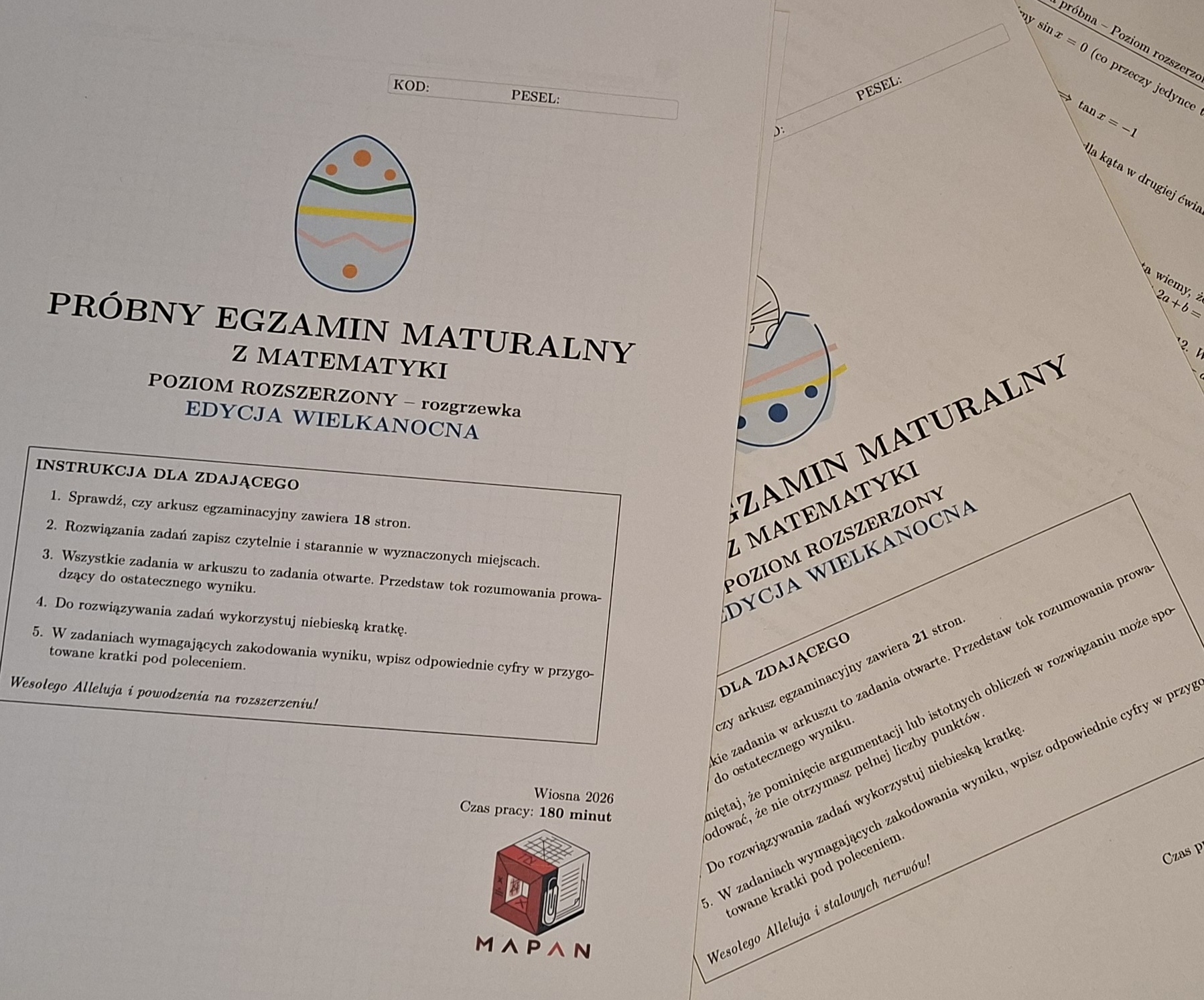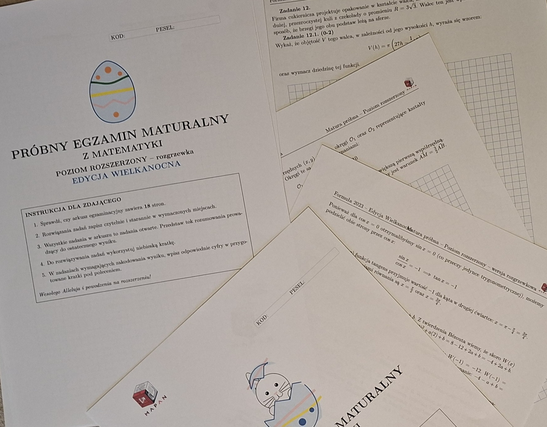 To pakiet dwóch pełnowymiarowych arkuszy na poziomie rozszerzonym (Formuła 2023), osadzonych w lekkim, wielkanocnym klimacie. Zadania mają świąteczny motyw (zajączki, pisanki, pieczenie mazurków), co fajnie rozładowuje przedegzaminacyjny stres, ale matematycznie to absolutnie poważna sprawa.