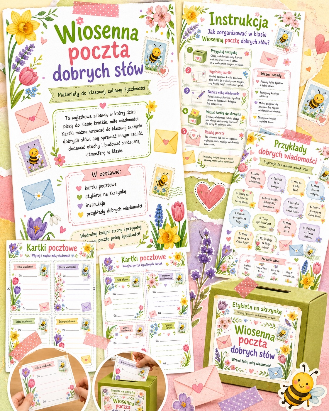 W środku znajduje się 6 stron do wydruku: kolorowe kartki pocztowe, etykieta na klasową skrzynkę, instrukcja organizacji zabawy oraz przykłady miłych wiadomości, które mogą zainspirować dzieci do pisania własnych dobrych słów. 🌷✉️
