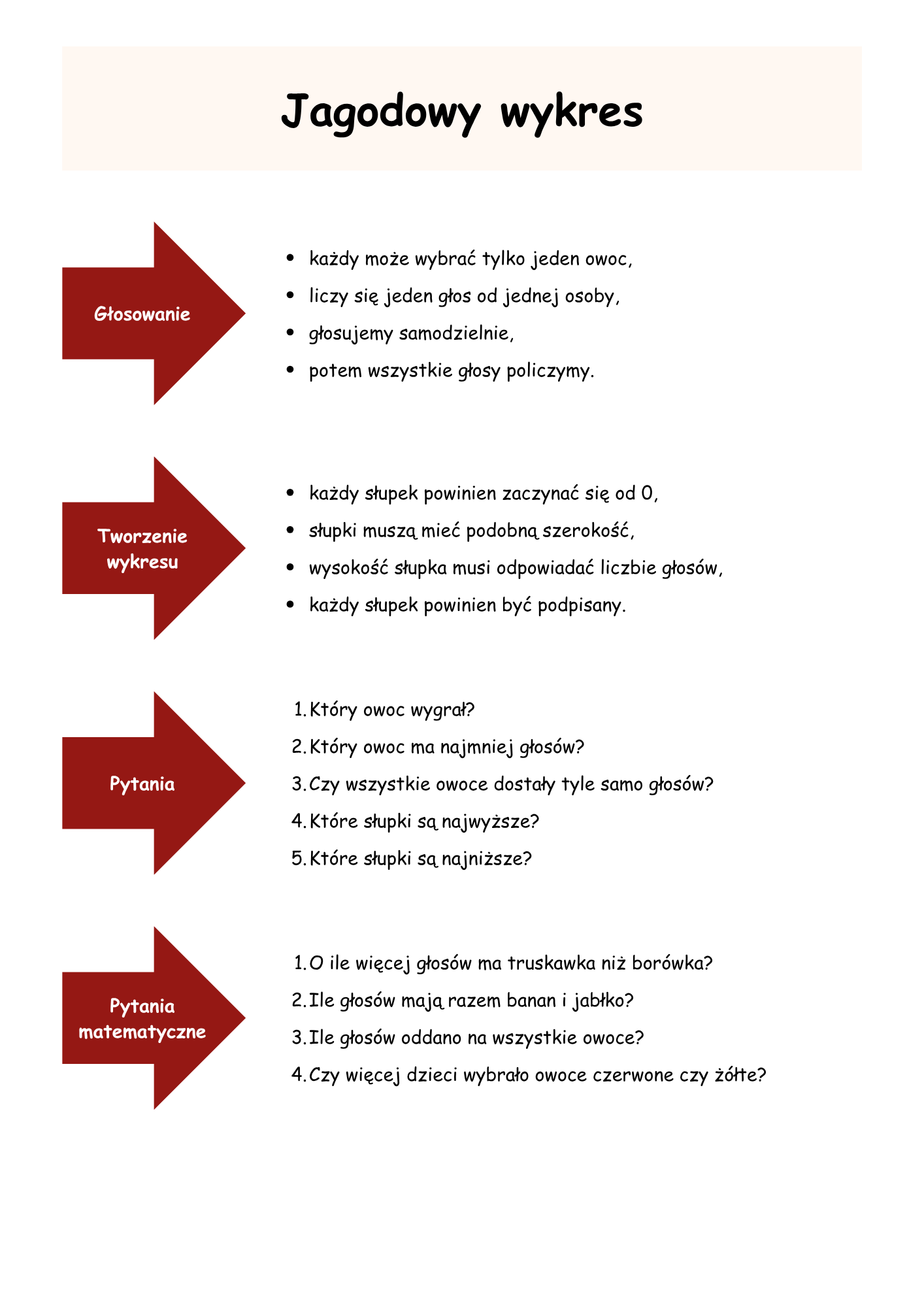 truskawka, borówka, winogrona, jabłko, banan i pomarańcza. Następnie dzieci rozmawiają o tym, jakie owoce znają i lubią, uczą się zasad głosowania, a potem tworzą wykres na podstawie zebranych głosów. Kolejne pytania pomagają im analizować dane: który owoc wygrał, który dostał najmniej głosów, czy głosów było tyle samo, które słupki są najwyższe i najniższe, ile głosów oddano łącznie.