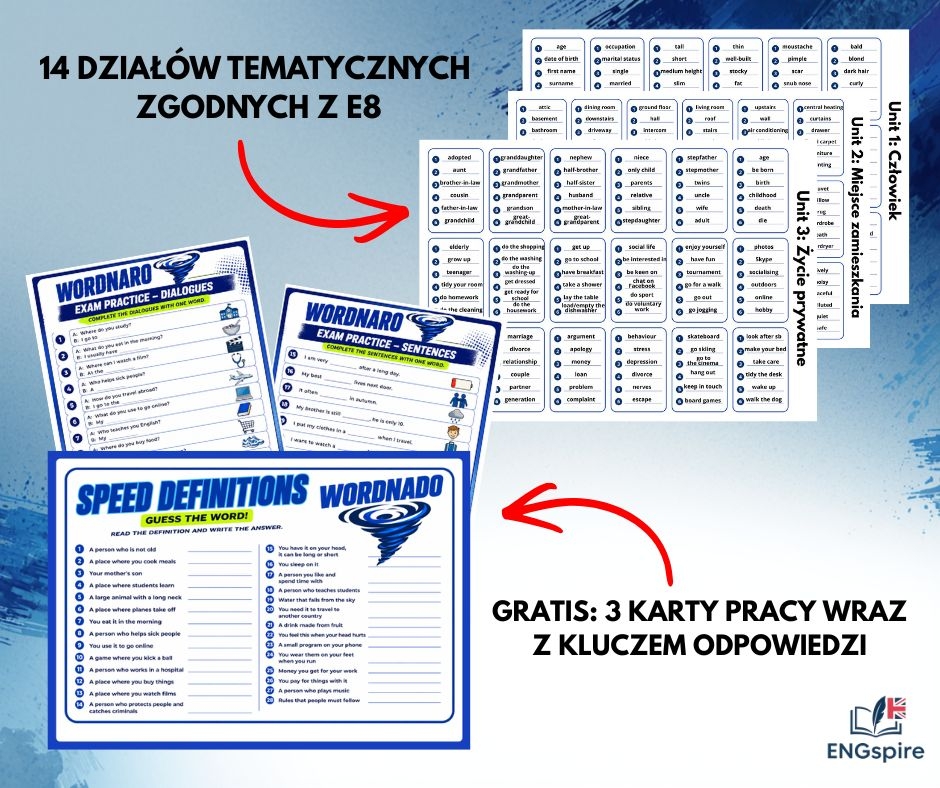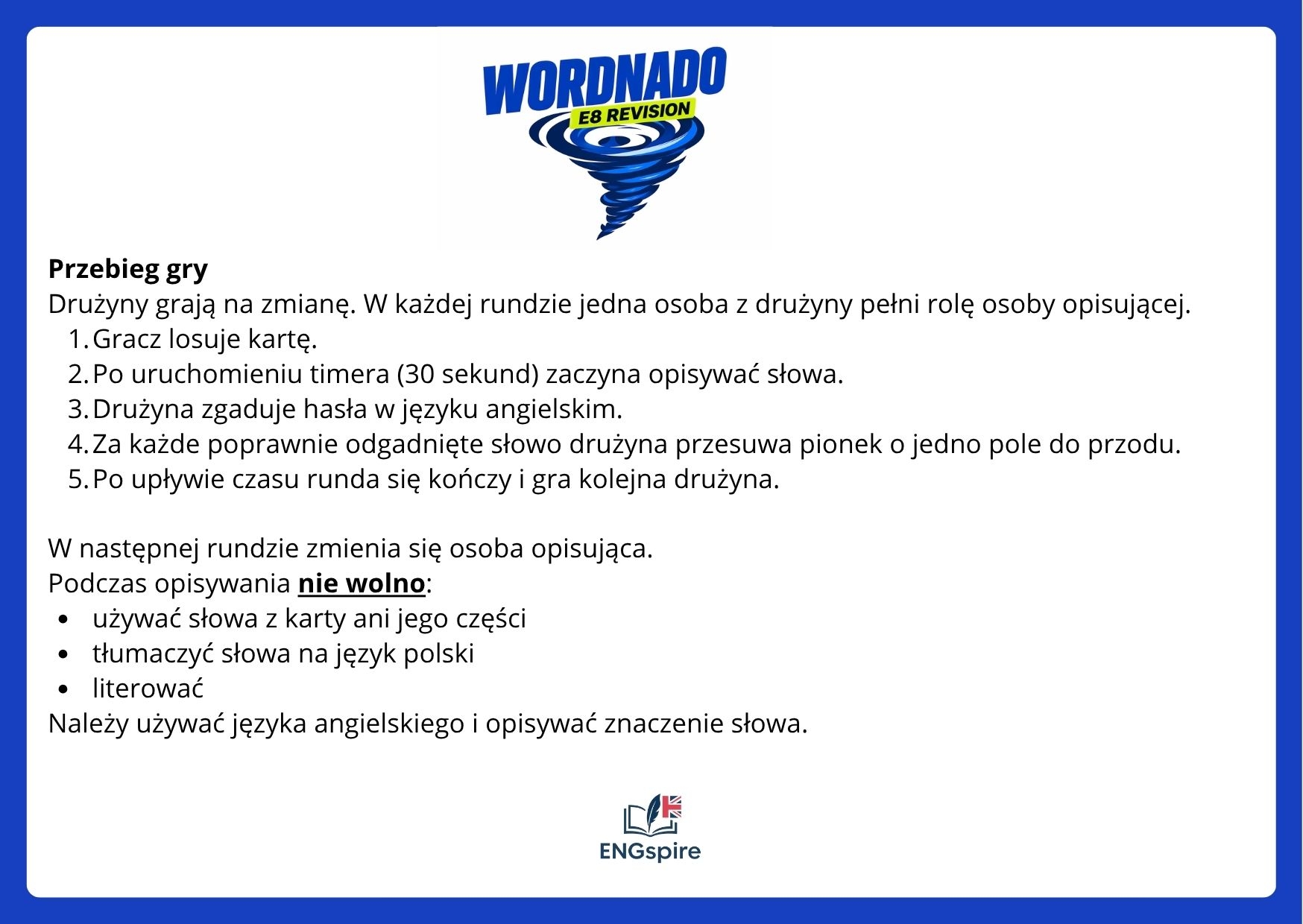 WORDNADO E8 to dynamiczna gra językowa inspirowana Aliasem, stworzona specjalnie do powtórek przed egzaminem ósmoklasisty.