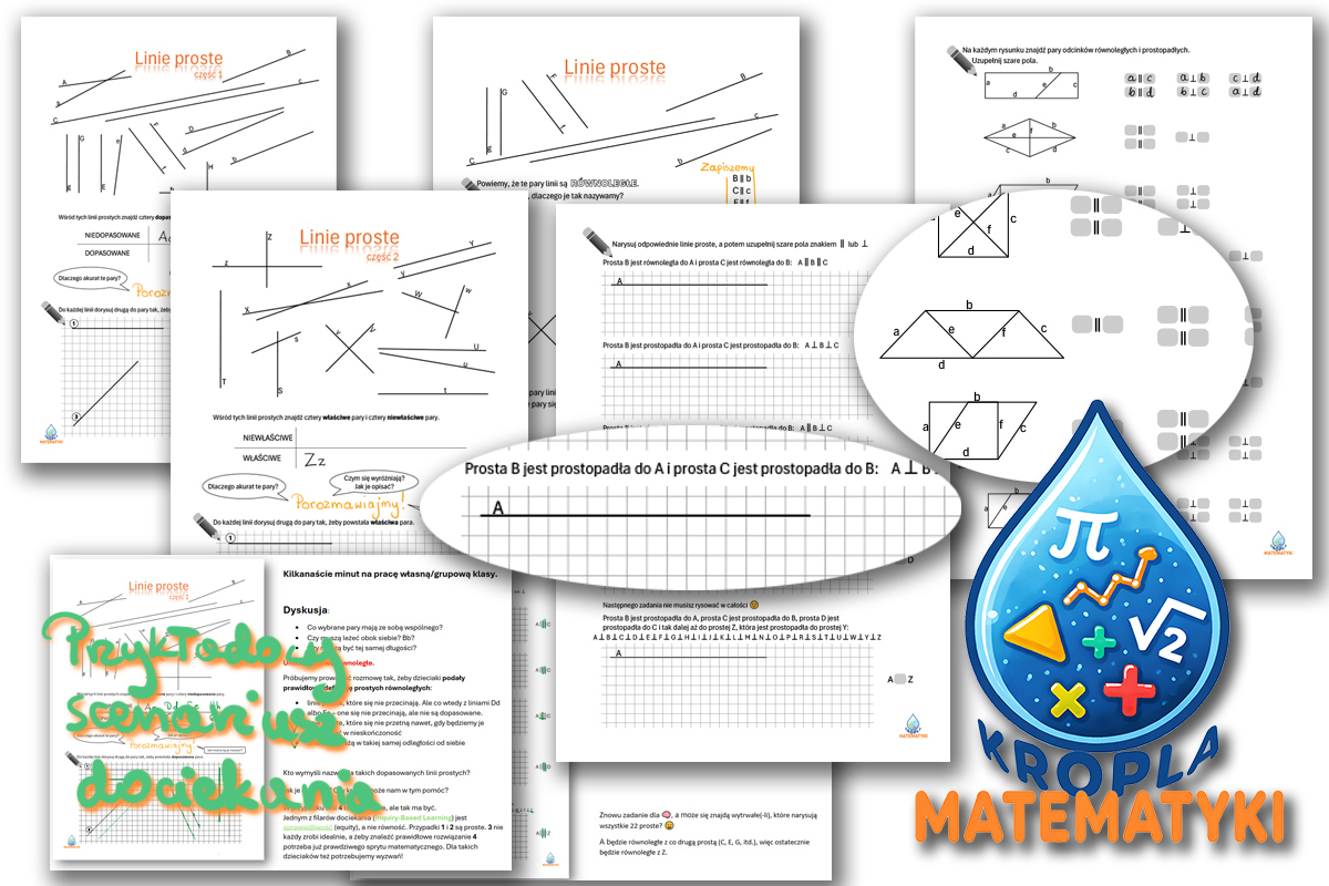 Te karty pracy zaprojektowałam tak, aby wprowadzić pojęcia równoległości i prostopadłości w sposób intuicyjny. Zamiast zaczynać od definicji, zaczynamy od obserwacji, porównywania i szukania "pasujących" do siebie par.