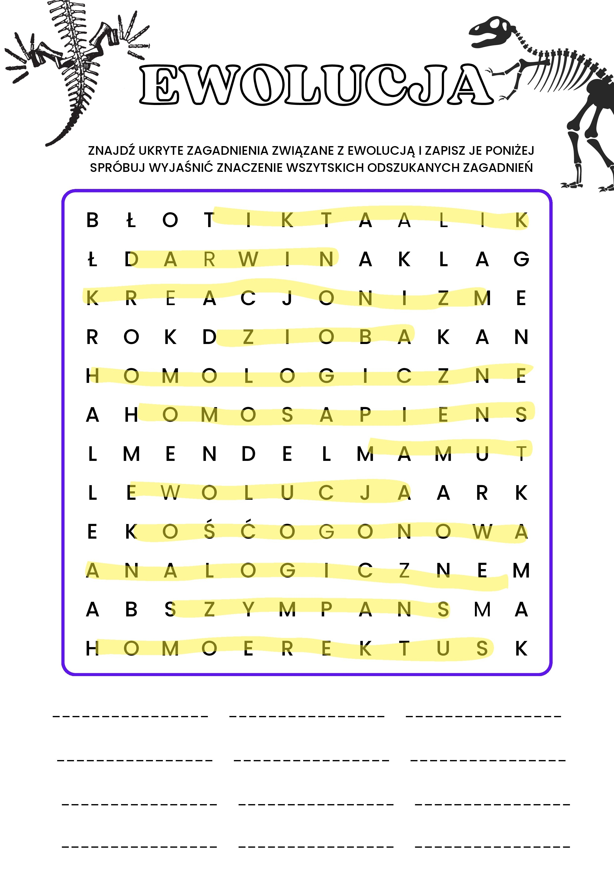 Wykreślanka doskonale sprawdzi się na lekcji powtórzeniowej. Uczniowie nie tylko muszą wyszukac ukryte pojęcia związane z ewolucją, ale również wyjaśnić ich znaczenie, dzięki czemu lepiej utrwalać wiedzę z zakresu ewolucji.