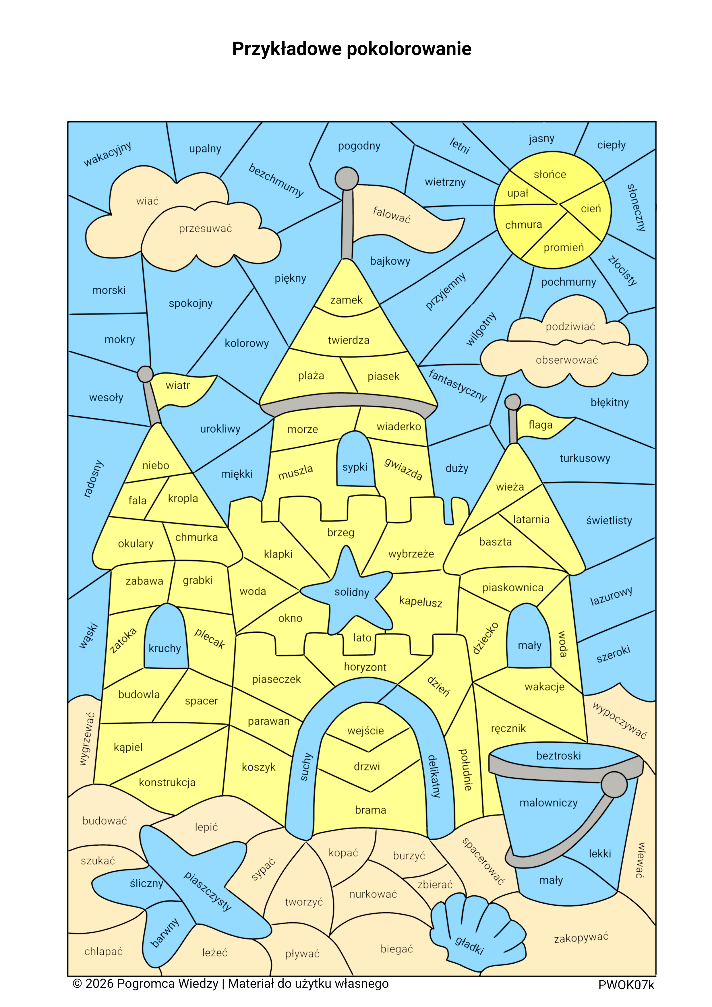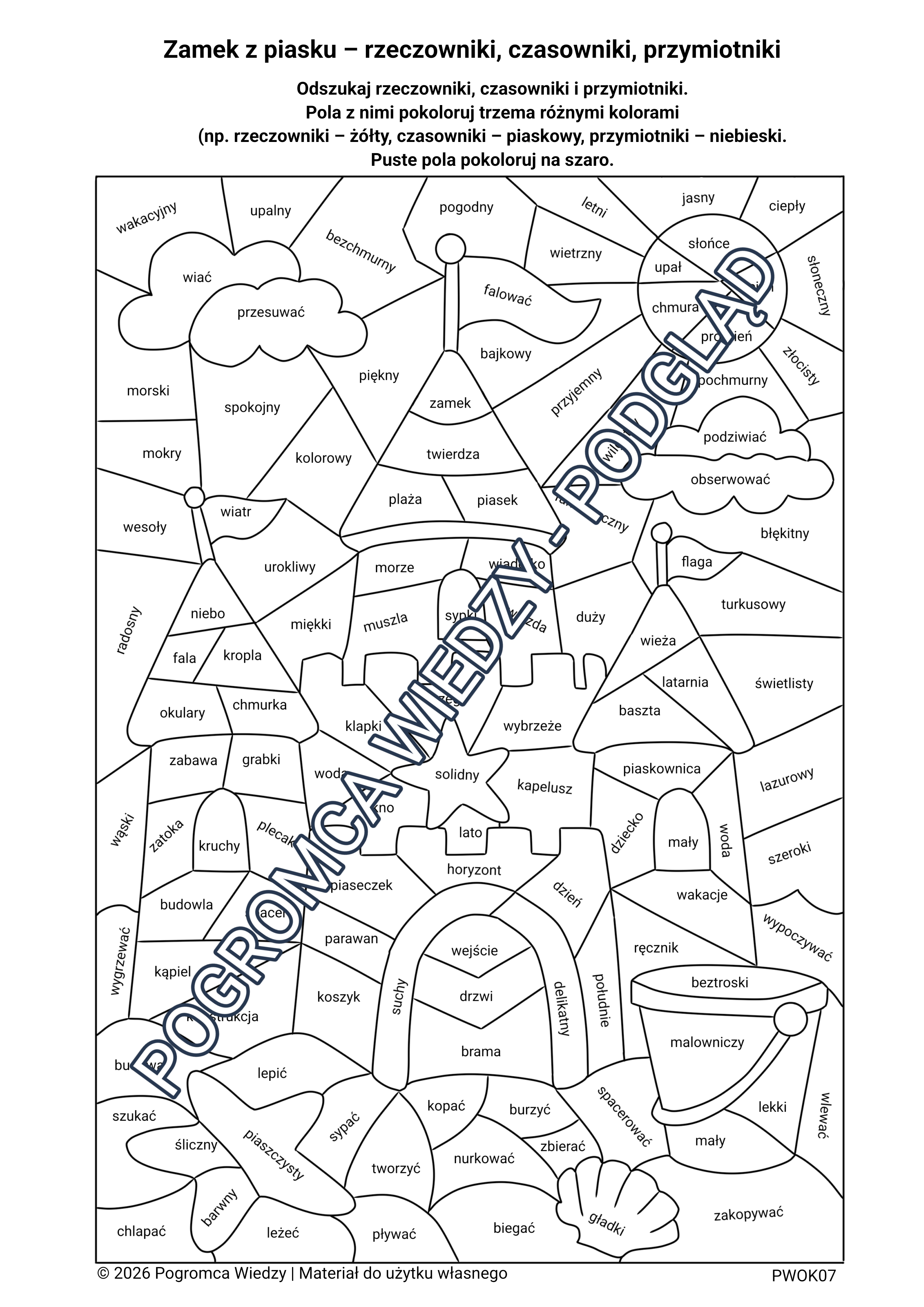 Wakacyjna karta pracy utrwalająca części mowy (rzeczowniki, czasowniki, przymiotniki). Zadaniem ucznia jest odnalezienie wyrazów i pokolorowanie ich według kategorii. To połączenie nauki i zabawy, idealne na letnie lekcje i powtórki. Materiał w formacie PDF zawiera również klucz odpowiedzi.
