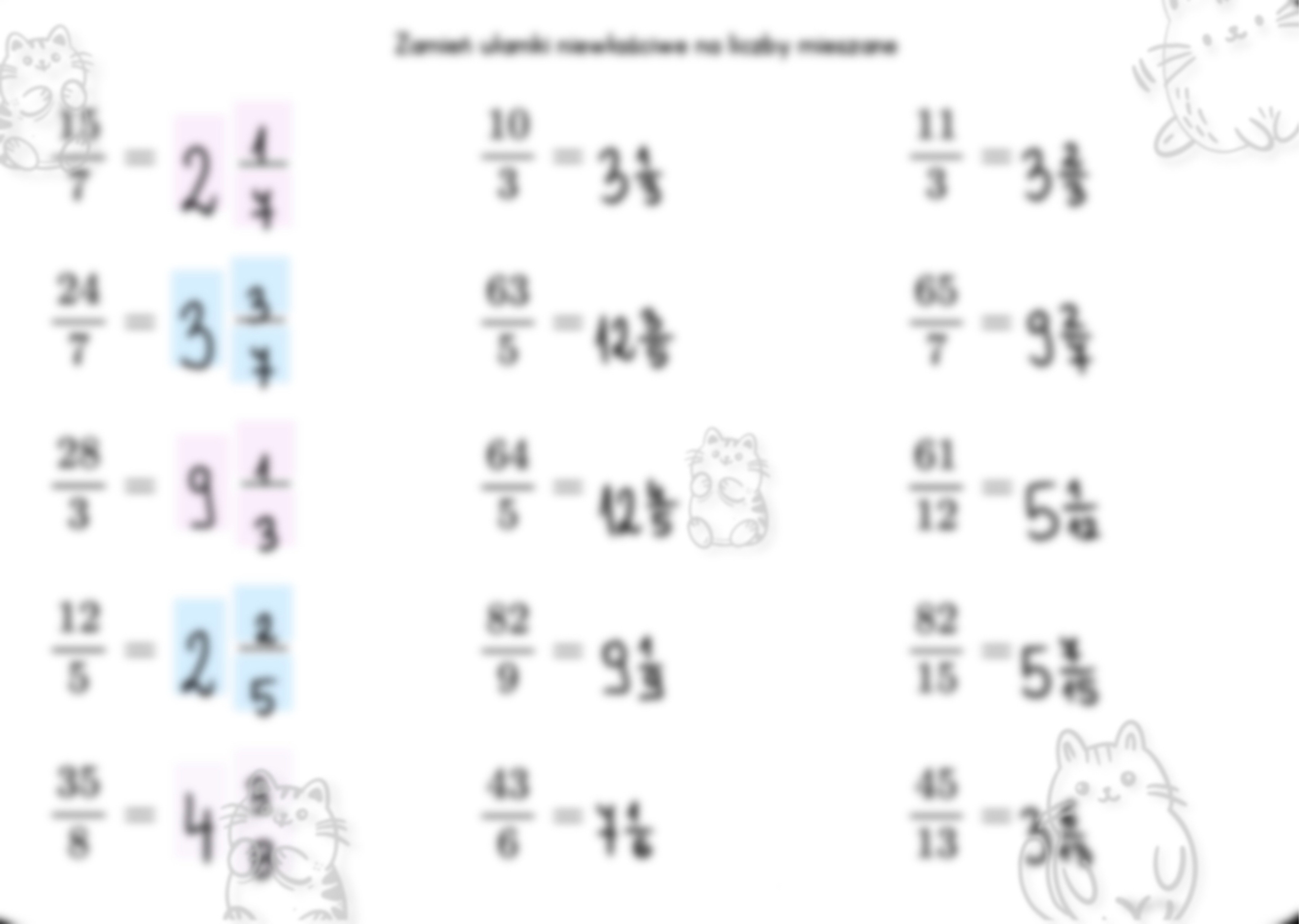 Przyjazna i estetyczna karta pracy, dzięki której uczniowie w atrakcyjny sposób utrwalą umiejętność zamiany ułamków niewłaściwych na liczby mieszane 🐱.