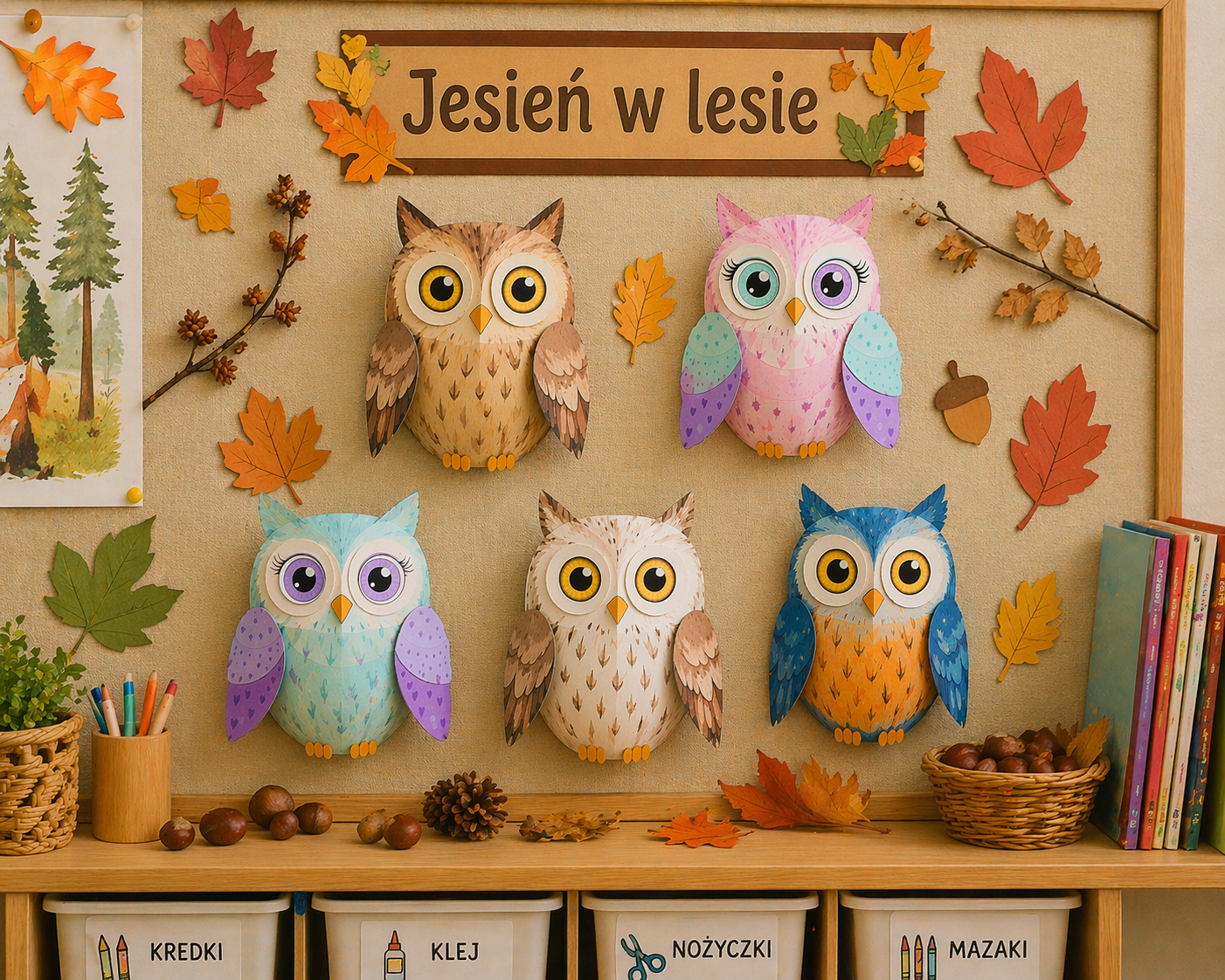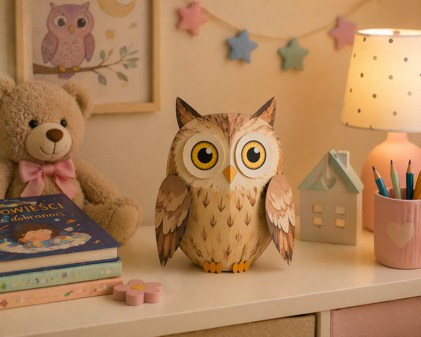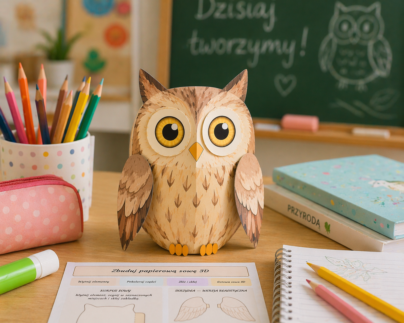 Najpierw wycinasz wszystkie części ✂️, potem je kolorujesz 🎨, a na końcu składasz i sklejasz – dzięki temu praca jest estetyczna i uporządkowana. Efekt? Urocza, trójwymiarowa sowa gotowa do dekoracji klasy lub pokoju! 🏡✨