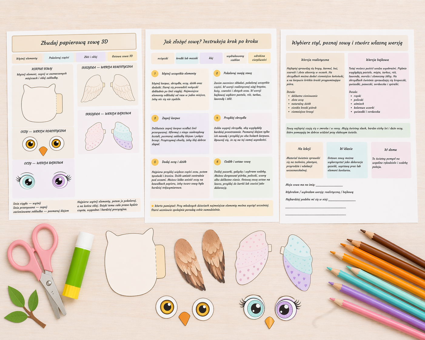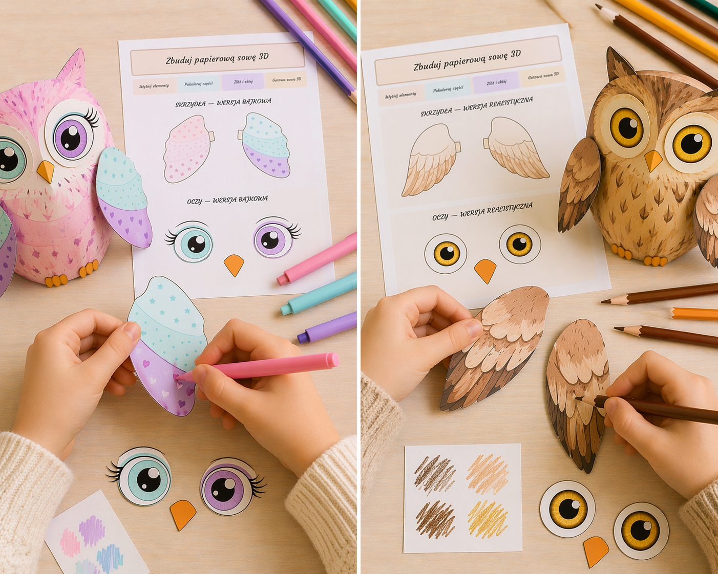 Stwórz własną, wyjątkową sowę z papieru i daj się ponieść wyobraźni! Ten materiał to gotowy szablon oraz prosta instrukcja, dzięki której dzieci (i dorośli 😉) mogą wykonać piękną, przestrzenną sowę w dwóch stylach: realistycznym lub bajkowym.