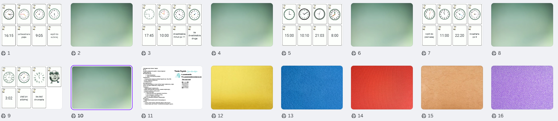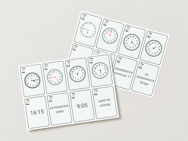 Krótka, poręczna i bardzo praktyczna gra karciana do ćwiczenia odczytywania godzin w różnych formach zapisu. Idealna na lekcje matematyki, zajęcia wyrównawcze lub do pracy w domu. Uczniowie łączą te same godziny na zegarze wskazówkowym z odpowiadającym im zapisem cyfrowym lub słownym, rozwijając spostrzegawczość i logiczne myślenie. Karty zawierają różne rodzaje zegarów - z cyferblatem z cyframi arabskimi, rzymskimi, a także bez cyfr.