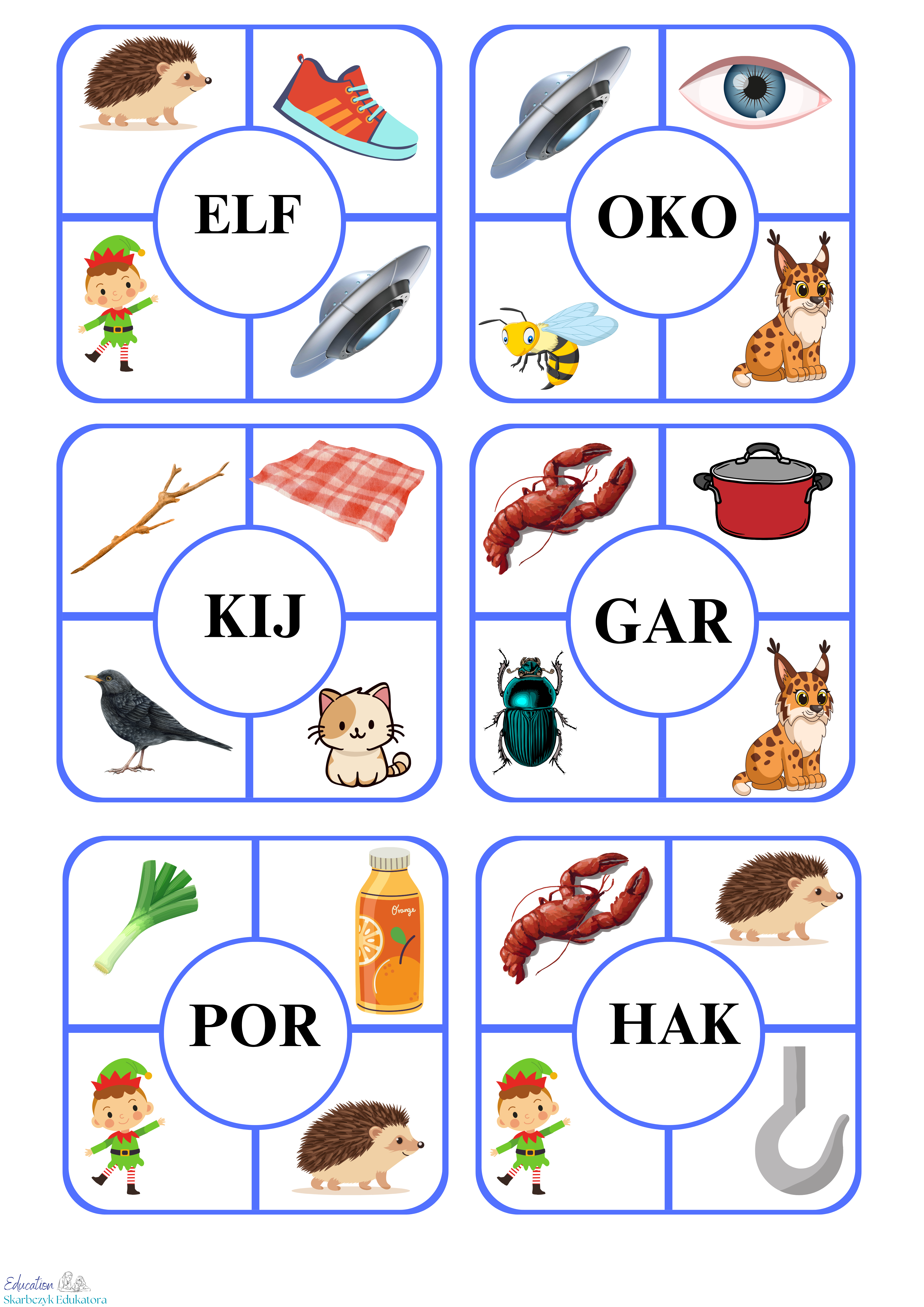 Zestaw 56 kart edukacyjnych to fantastyczna pomoc w nauce czytania i pisania dla dzieci w wieku przedszkolnym i wczesnoszkolnym. Zabawa polega na dopasowaniu obrazka do odpowiedniego podpisu.