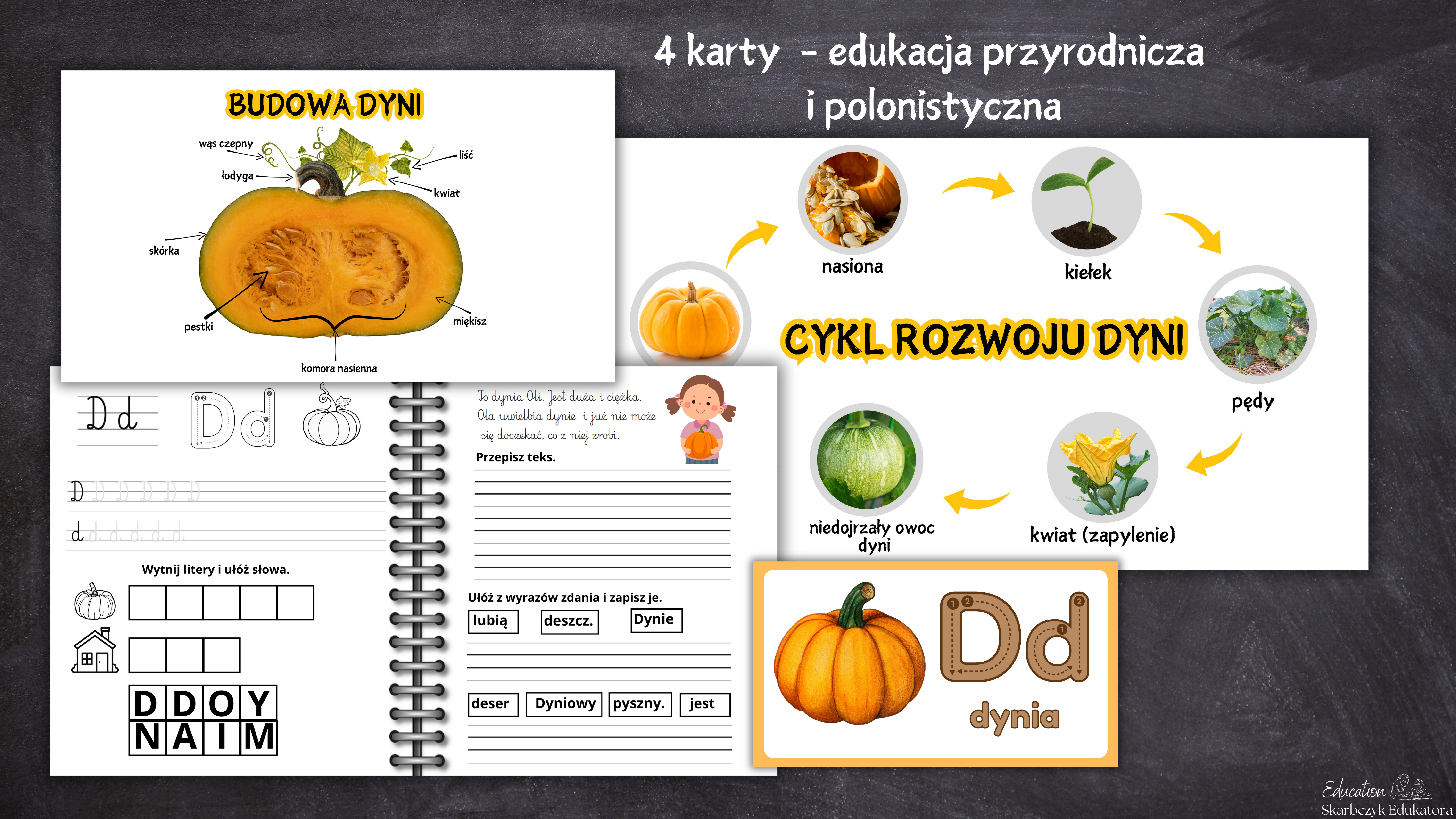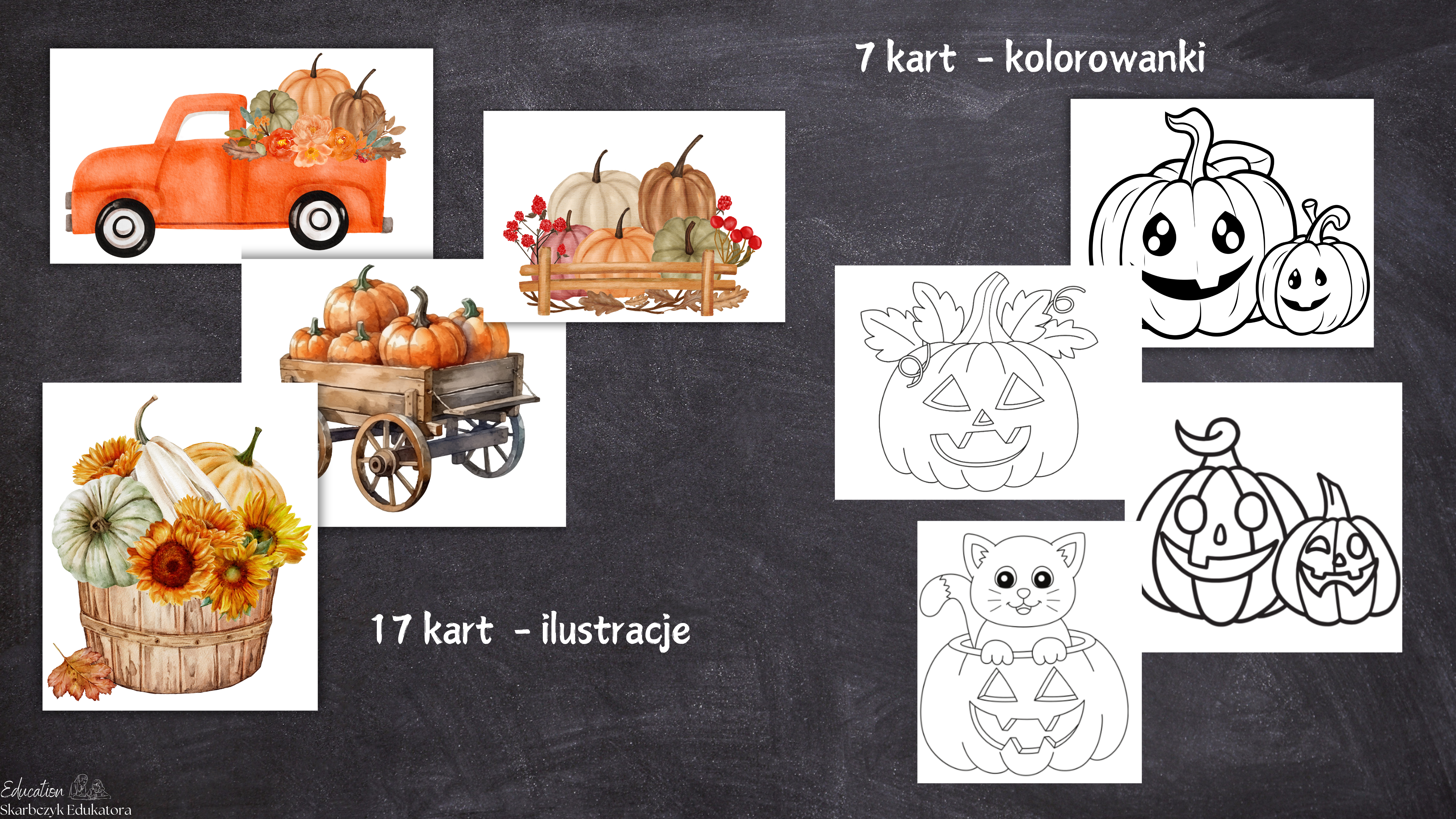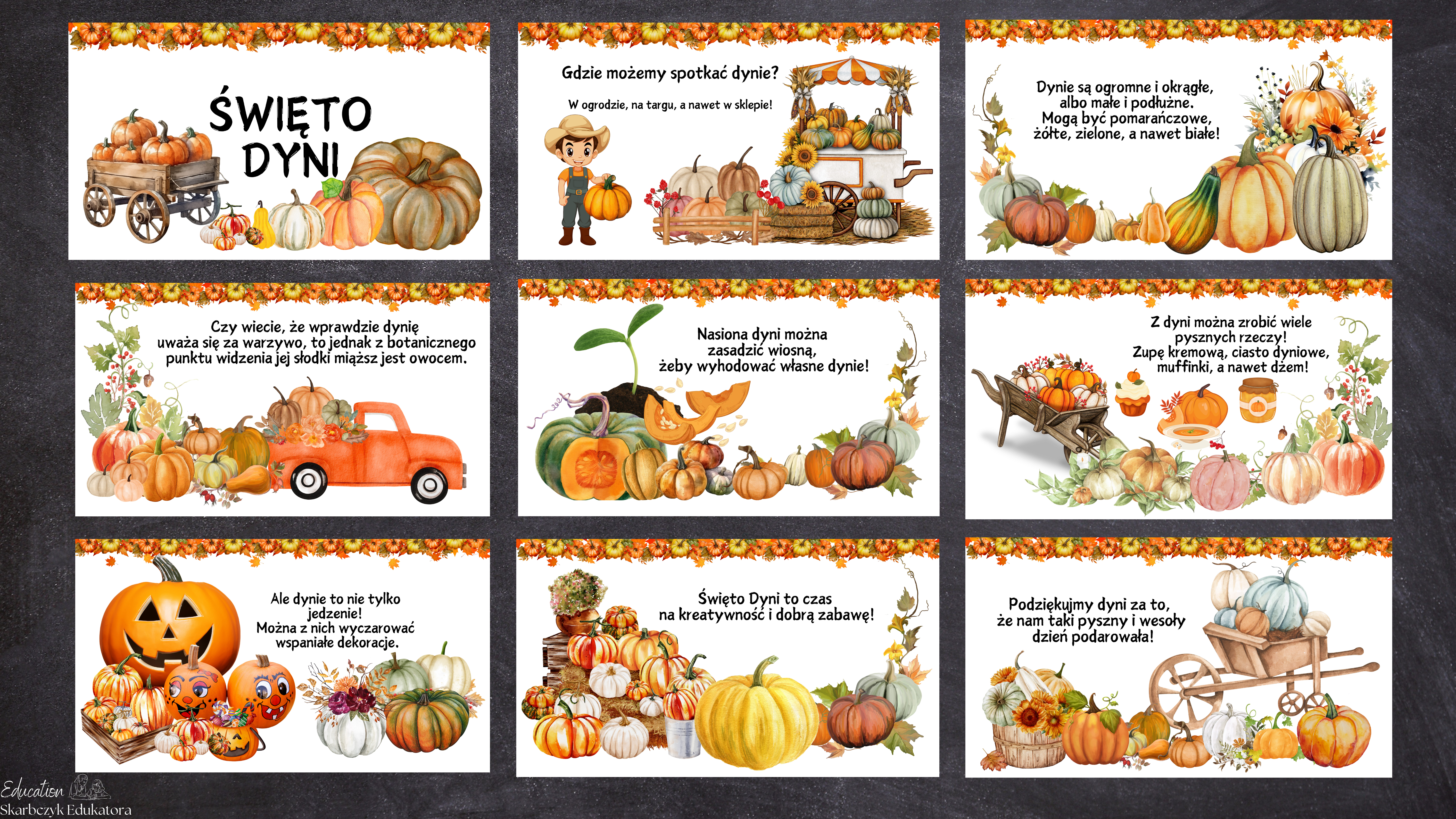 ZESTAW DYNIOWY - to 50 stronicowy plik pdf do samodzielnego wydruku. Tu znajdziesz wszystko, aby przeprowadzić zajęcia związane z Dniem Dyni.
