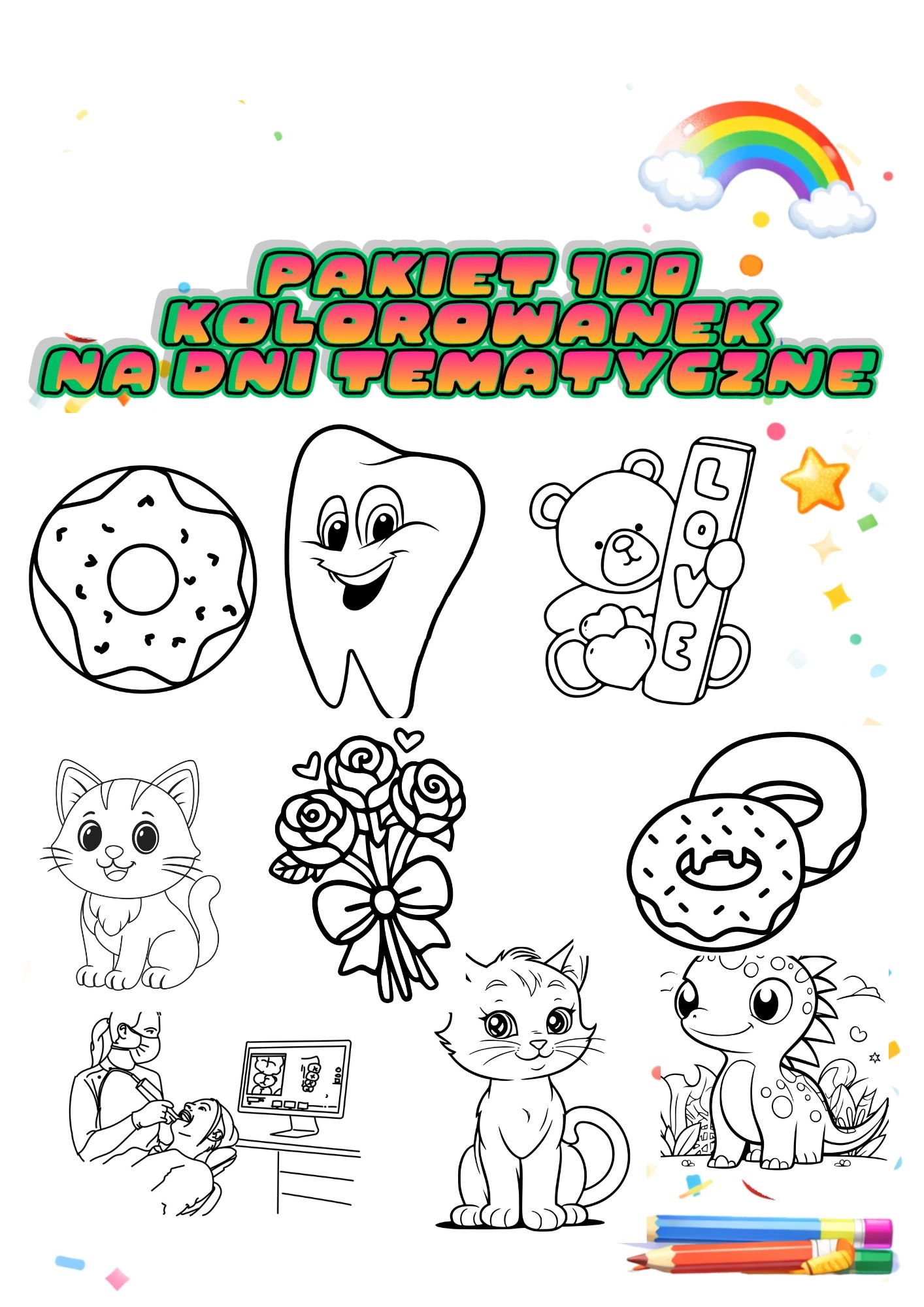 Pakiet 100 kolorowanek na dni tematyczne to bogaty zestaw materiałów idealnych do wykorzystania w przedszkolu, szkole oraz w domu. Kolorowanki pozwalają w ciekawy i atrakcyjny sposób wprowadzić dzieci w tematykę wyjątkowych dni w ciągu roku, jednocześnie wspierając rozwój motoryki małej, koncentracji oraz kreatywności.