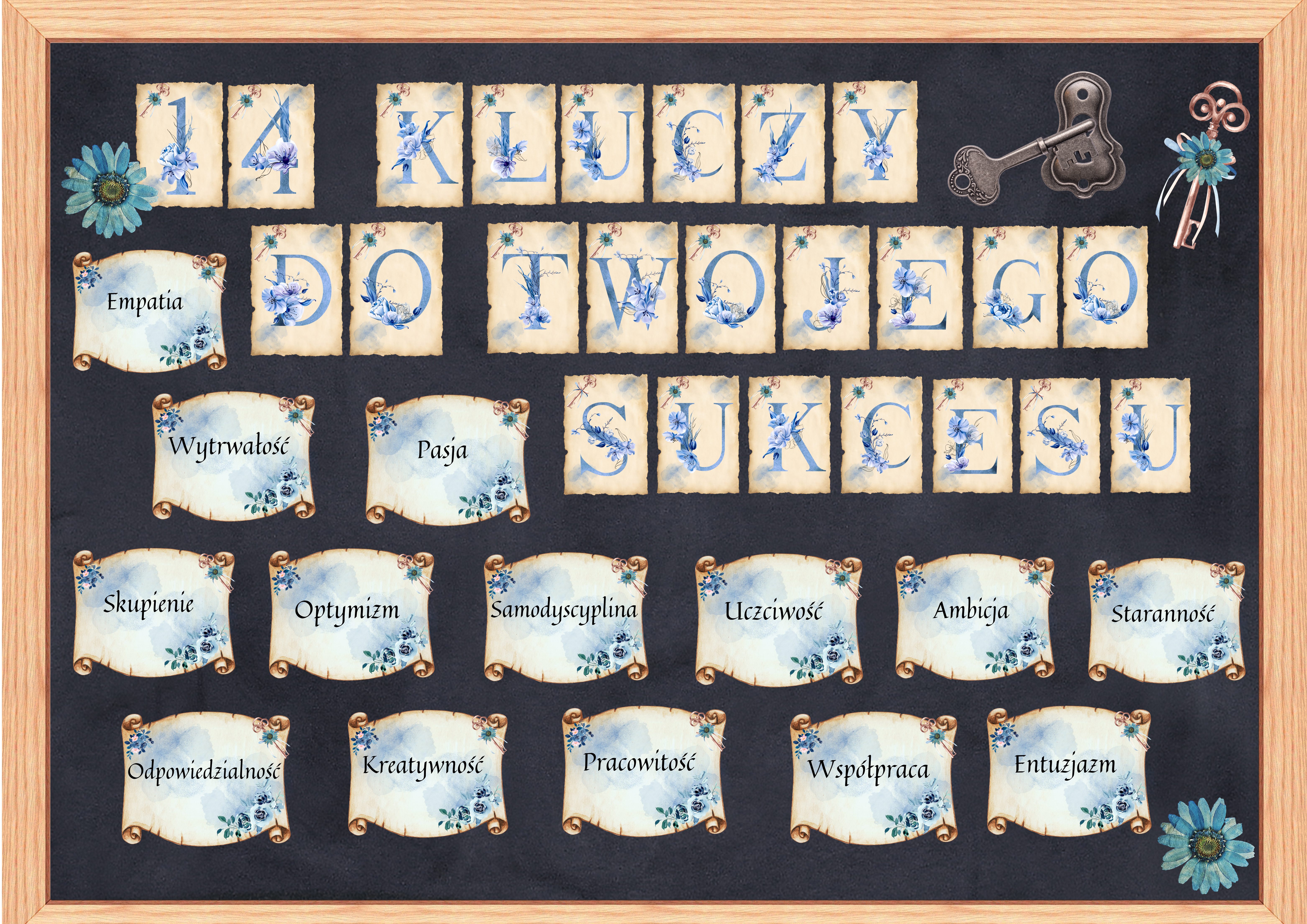 - przygotowany napis KLUCZY DO TWOJEGO SUKCESU, ale można go zmodyfikować na np. KLUCZE DO SUKCESU, (dwie litery na stronie A4)