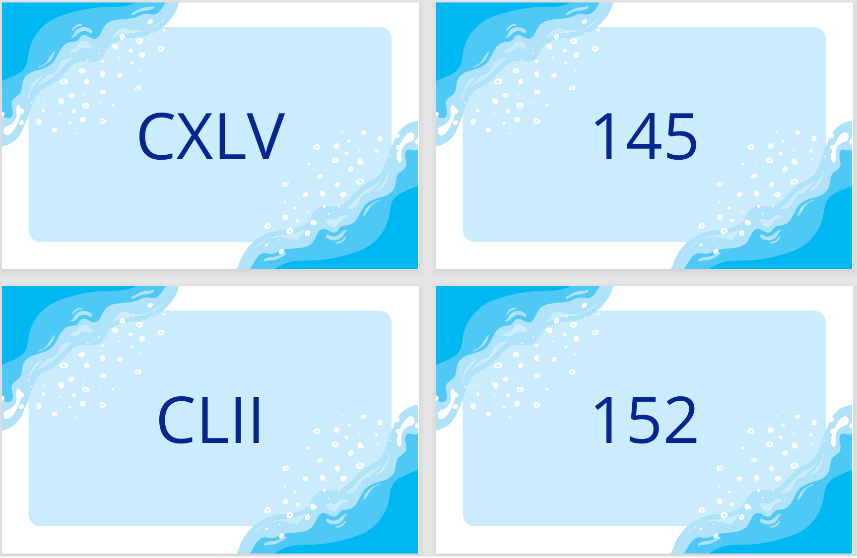 150 dwustronnych fiszek – na jednej stronie liczba rzymska, na drugiej odpowiednik arabski.