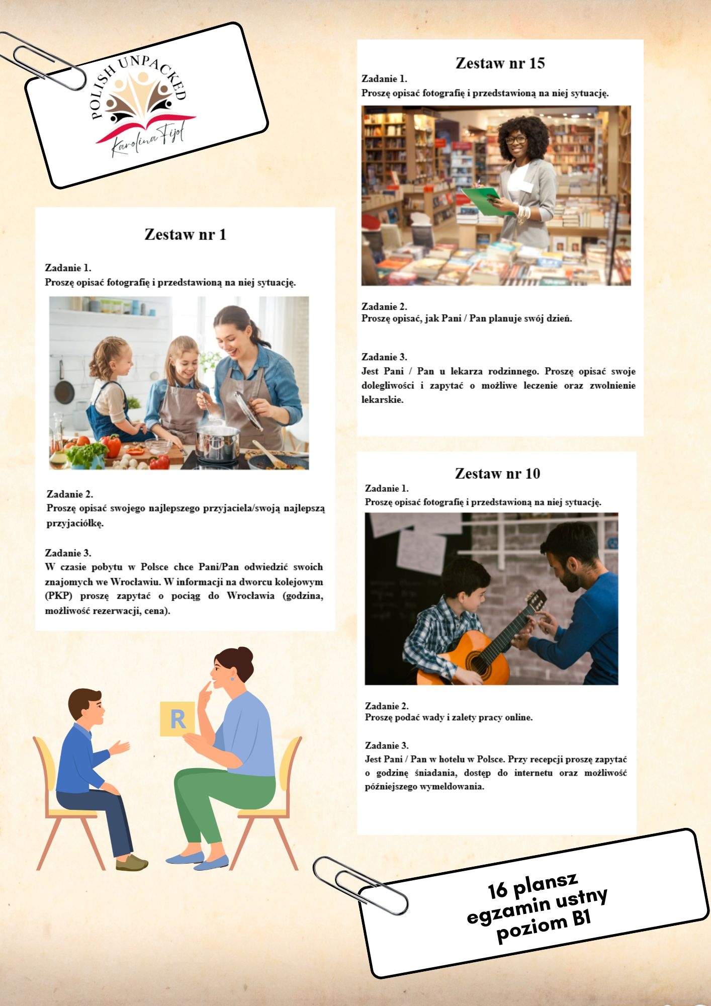 🗣️Zestaw 16 plansz egzaminacyjnych przygotowanych na wzór oficjalnych materiałów wykorzystywanych w części ustnej egzaminu certyfikatowego z języka polskiego jako obcego na poziomie B1.