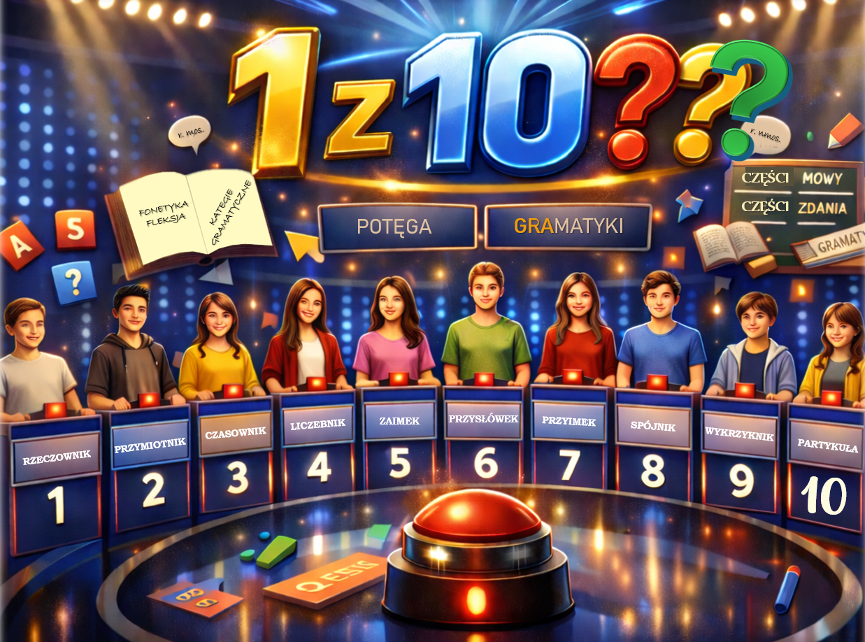 1 z 10 GRAmatyka to dynamiczna gra dydaktyczna inspirowana znanym formatem, która przenosi emocje studia telewizyjnego prosto na lekcję języka polskiego.