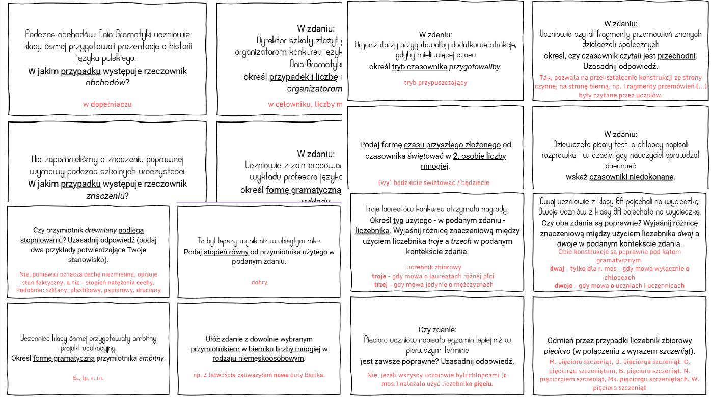 Uczniowie klas 6–8 powtarzają najważniejsze zagadnienia z gramatyki w formie angażującej rywalizacji, utrwalając wiedzę potrzebną przed egzaminem ósmoklasisty. Materiał obejmuje kluczowe treści z zakresu części mowy uporządkowane na kartach atrakcyjnej formuły gry. Jasne zasady, system eliminacji i element napięcia sprawiają, że nawet wymagające zagadnienia stają się przystępne i motywujące. To gotowe narzędzie do efektywnej powtórki, które łączy naukę z emocjami prawdziwego teleturnieju.