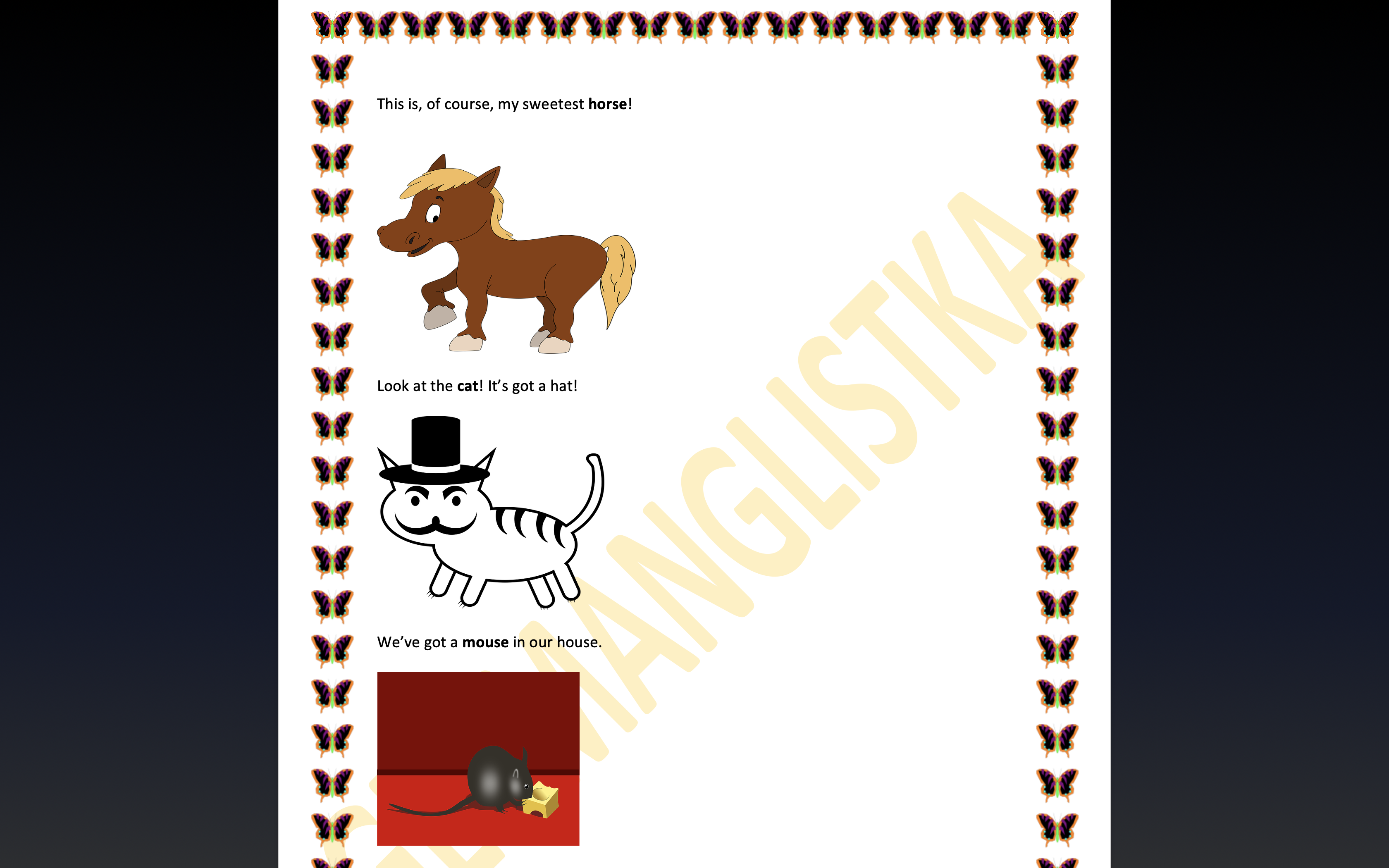 20 rymowanek ze zwierzętami - język angielski Materiał zawiera 20 krótkich rymowanek ułatwiających zapamiętywanie 21 nazw zwierzątek w języku angielskim. Czytając je kilkukrotnie na głos, uczeń nie tylko łatwiej zapamięta wiele nazw zwierząt, ale także pozna wiele przydatnych zwrotów.