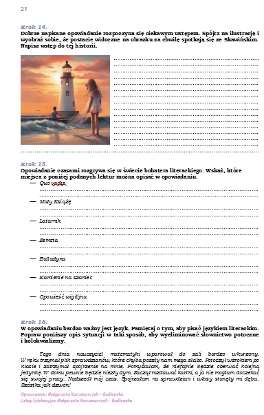 W ćwiczeniach znajdziecie między innymi: naukę tworzenia wstępu, rozwinięcia i zakończenia w opowiadaniu, sposoby na budowanie nastroju, wykorzystanie lektur obowiązkowych, warte zapamiętania motywy, sposoby wprowadzania: opisów: czasu, miejsca, przeżyć wewnętrznych, ćwiczenia z dialogiem, przydatne zwroty i wiele innych.