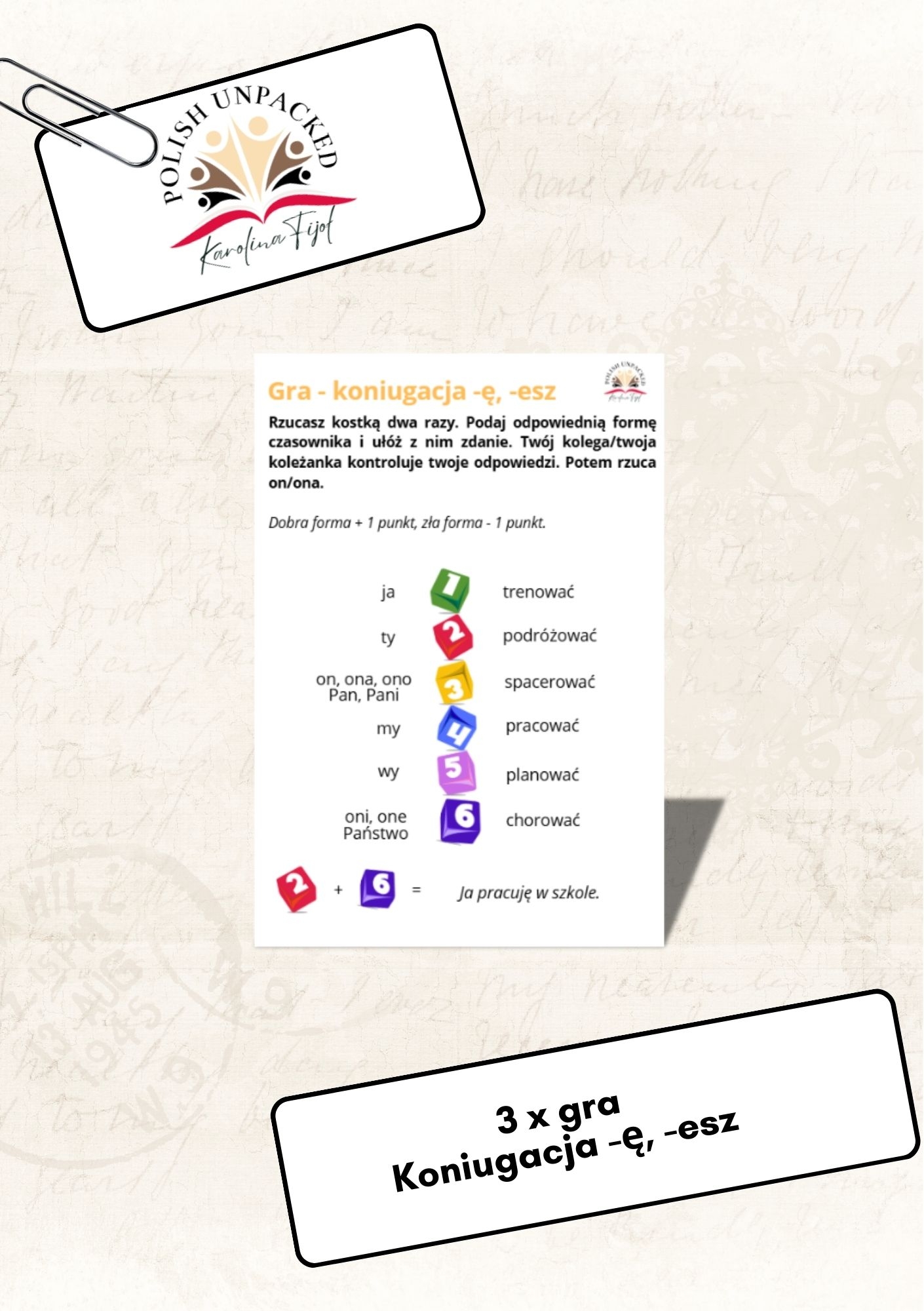 Gra ma na celu ćwiczenie odmiany czasowników koniugacji -ę, -esz na poziomie A1. Zestaw zawiera 3 różne warianty gry.