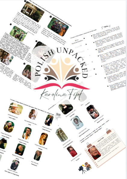 Zestaw do filmu "Pan Tadeusz": Karta pracy składa się z trzech zadań: pierwsze polega na dopasowaniu aktorów do bohatera, którego grają, drugie na dopasowaniu bohatera lektury do opisu, trzecie do opisania ukazanej w kadrze sceny. Zestaw zawiera zarówno puste karty pracy, jak i odpowiedzi.