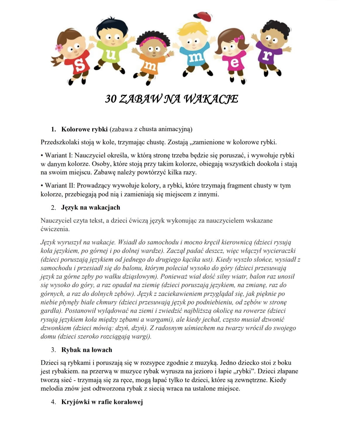 Zestaw zawiera 30 zabaw do wykorzystania podczas zajęć o tematyce wakacyjnej lub przez okres wakacji, Zawiera zabawy:
