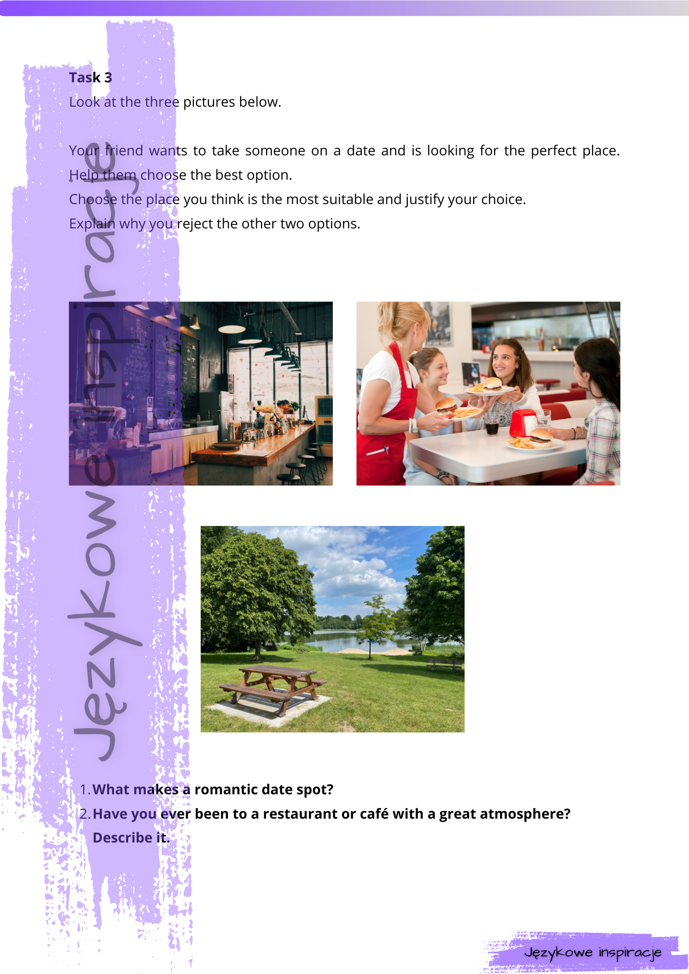 • Task 3: Wypowiedź oparta o materiał wspierający (3 zdjęcia plus polecenie) + dodatkowe pytania