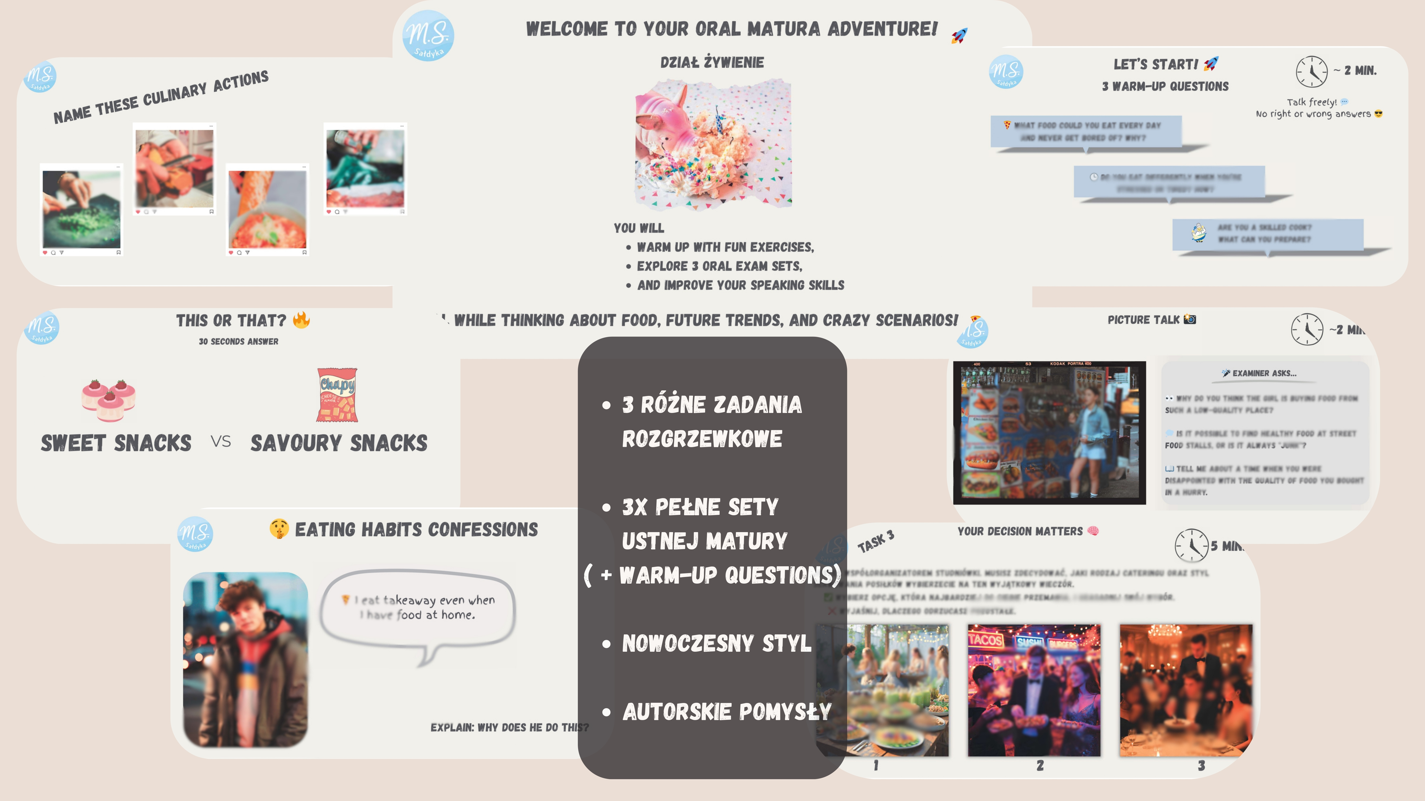 Moim uczniom już się "przejadły" typowe ćwiczenia i zestawy do matury ustnej oferowane przez podręczniki typu: opis zdjęcie, na którym uśmiechnięta rodzinka spożywa sałatkę owocową. Dlatego stworzyłam coś dla znudzonej i zniechęconej młodzieży (GEN Z) :)