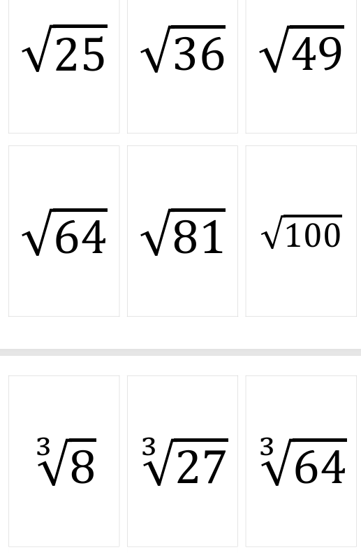 Zestaw 45 fiszek powtórzeniowych dotyczących obliczania w pamięci wartości pierwiastków kwadratowych i sześciennych z liczb naturalnych i całkowitych oraz elementarnych ułamków. Fiszki sprawdzą się jako kilkuminutowy przerywnik lekcji i powtórka przed egzaminem, można je także wykorzystać jako rozpoczęcie lekcji (np. każdy uczeń przed wejściem do sali otrzymuje jedną fiszkę i musi podać odpowiedź, po czym wchodzi do sali). Fiszki sprawdzą się również jako samodzielna powtórka ucznia w domu. Materiał odpowiedni dla uczniów klasy 8 SP, ale także dla klasy 7 SP, która już omówiła pierwiastki. Po samodzielnym wydrukowaniu proponuję je zalaminować, aby wydłużyć ich trwałość.