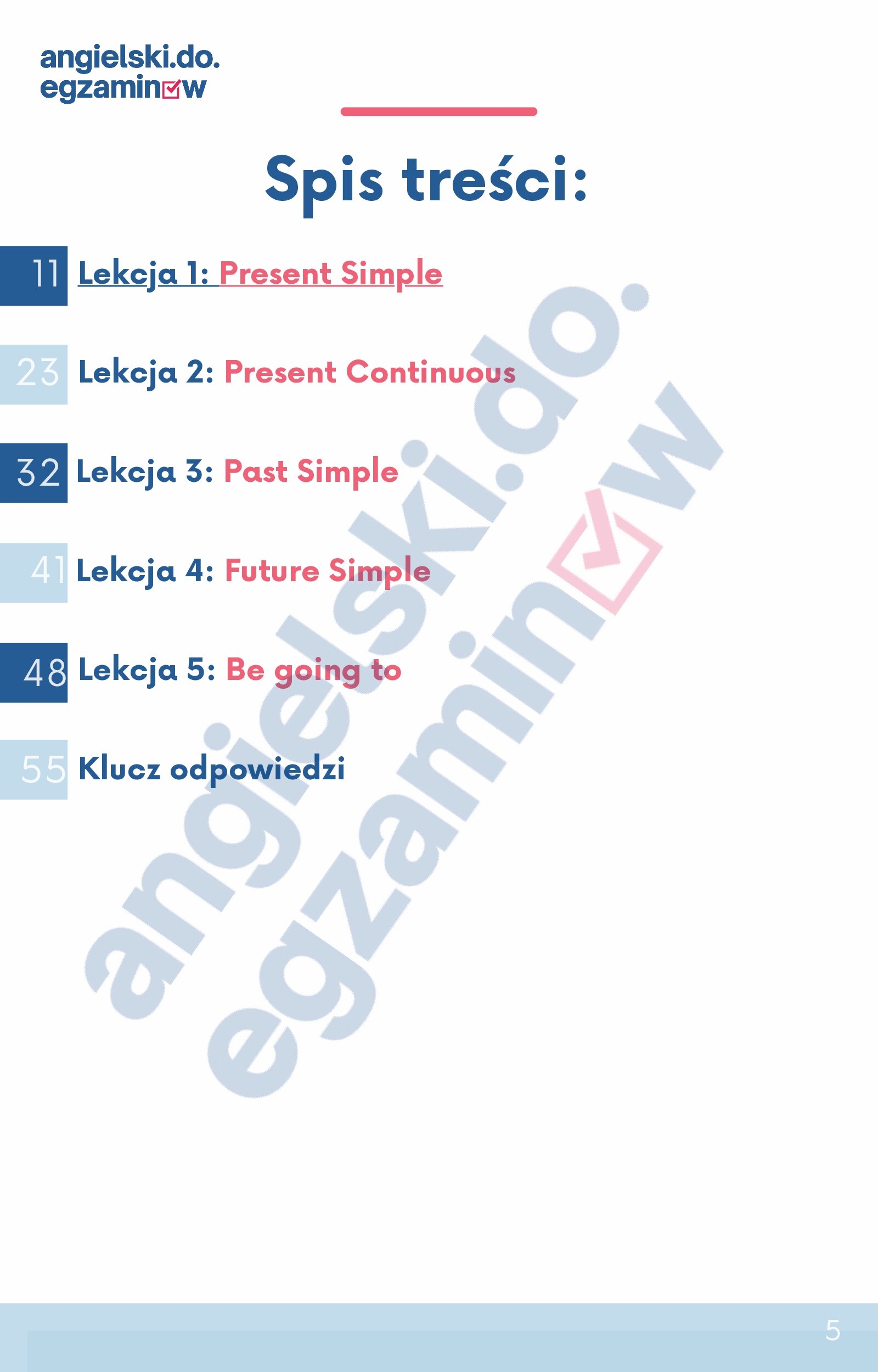 Ebook “5 Czasów na Zdany Egazamin. Matura Podstawowa / E8”, to materiał, dzięki któremu dokładnie krok po kroku poznasz i zaczniesz z łatwością używać podstawowe struktury gramatyczne: Present Simple, Present Continuous, Past Simple, Future Simple (will), Konstrukcja “Be going to”.