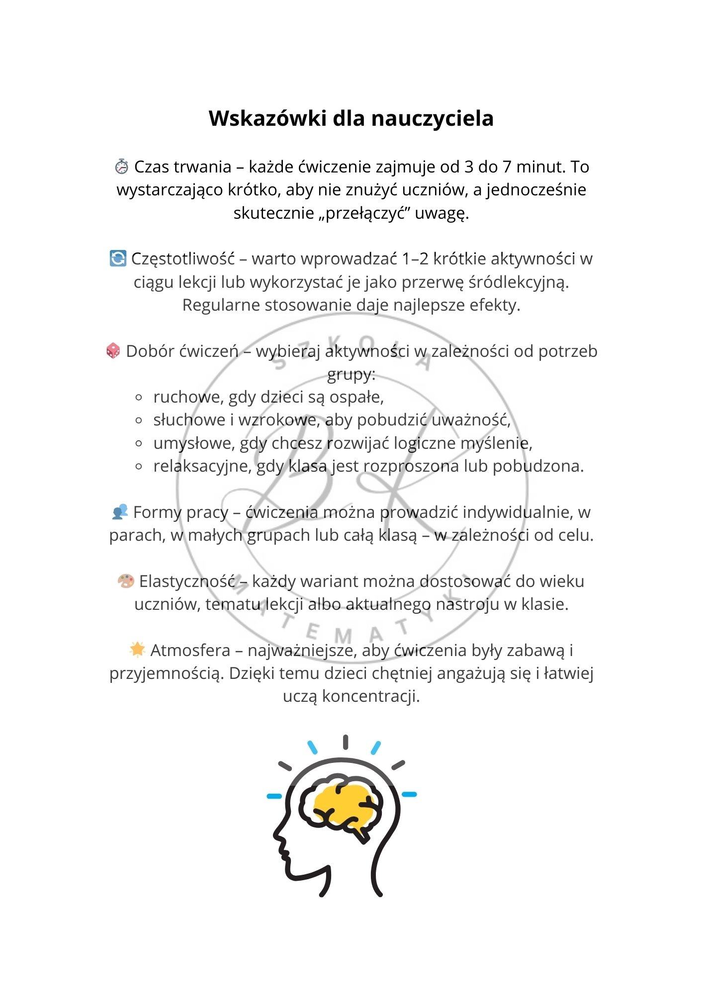 Przedstawiony zestaw 50 aktywnych pomysłów na zajęcia koncentracji został opracowany z myślą o pracy z uczniami w wieku szkolnym, ale z powodzeniem można je stosować także w grupach przedszkolnych czy w ramach zajęć świetlicowych. Ćwiczenia są krótkie, proste i nie wymagają skomplikowanych pomocy – ich siła tkwi w aktywizowaniu dzieci i angażowaniu różnych zmysłów: ruchu, słuchu, wzroku, myślenia logicznego oraz uważności.