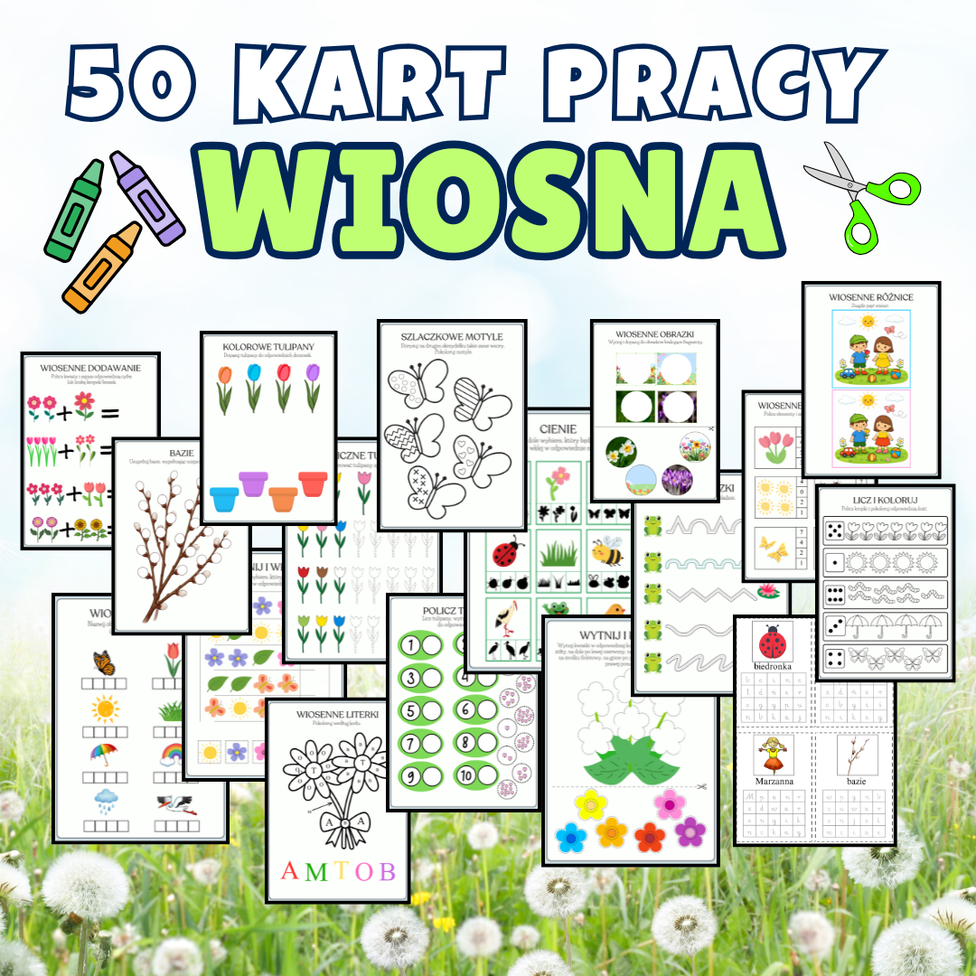 Szukasz gotowych materiałów na wiosenne zajęcia? Ten zestaw to aż 50 różnorodnych kart pracy, które w atrakcyjny sposób wspierają rozwój dziecka poprzez zabawę i naukę.