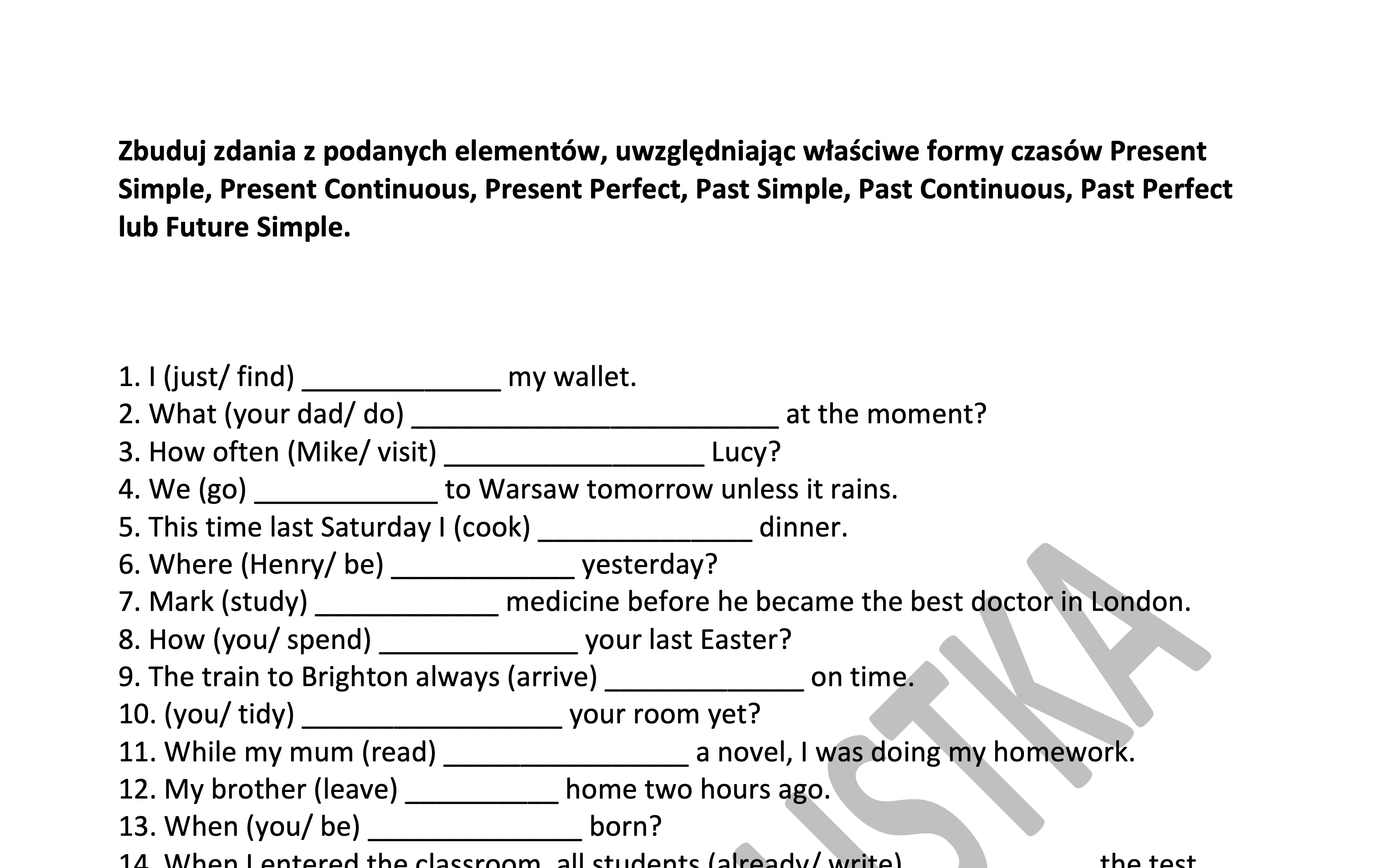 Materiał składa się z 30 zdań z kluczem. Zadaniem ucznia jest uzupełnienie luk w odpowiednim czasie, uwzględniając podane w nawiasach elementy. Dzięki takiemu ćwiczeniu można zorientować się, czy uczeń rozróżnia w praktyce następujące czasy: -Present Simple i Pr. Continuous -Present Perfect -Past Simple i Past Continuous -Past Perfect -Future Simple