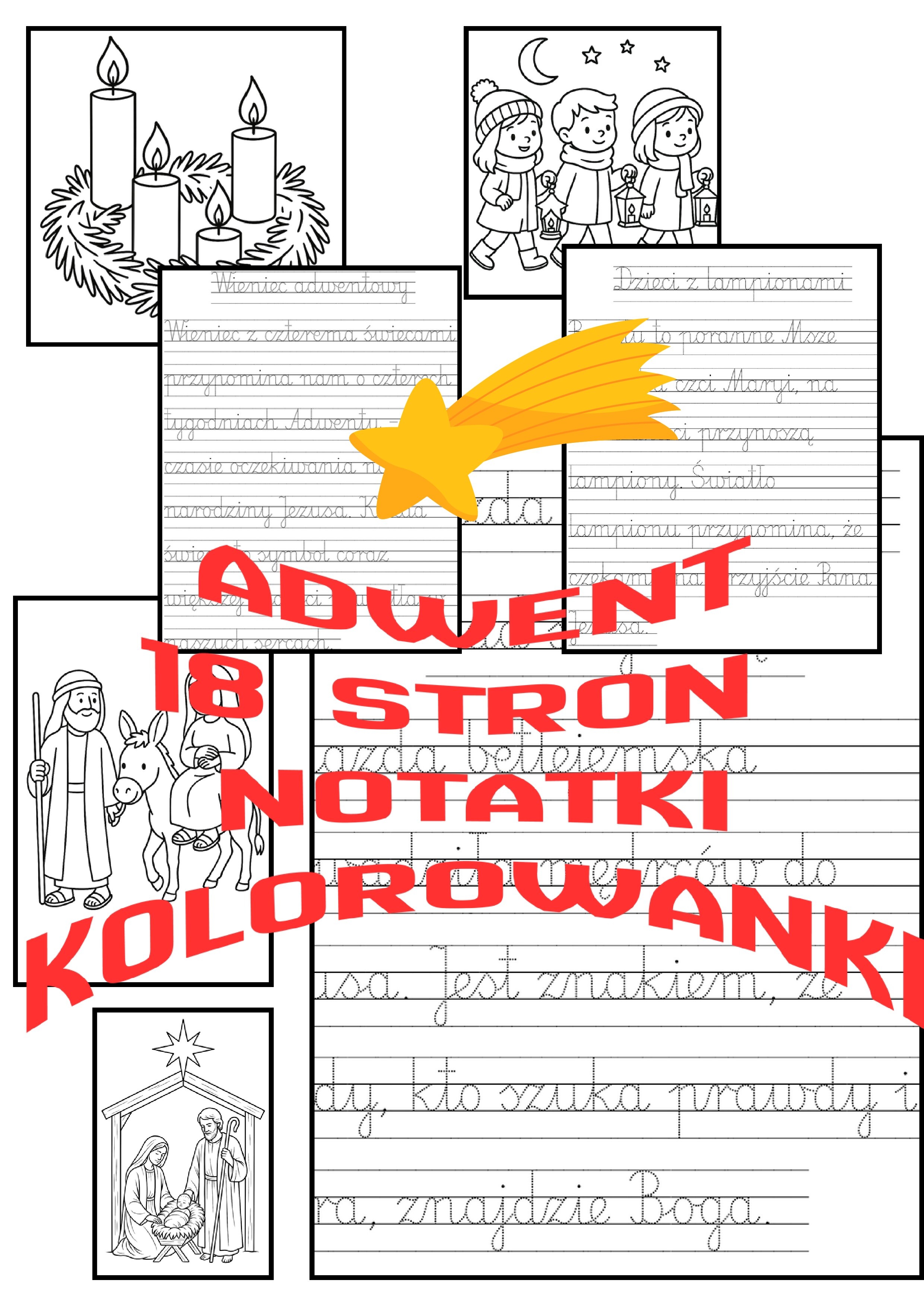 Zestaw zawiera 9 pięknych kolorowanek adwentowo-bożonarodzeniowych oraz 9 kart do pisania po śladzie.
