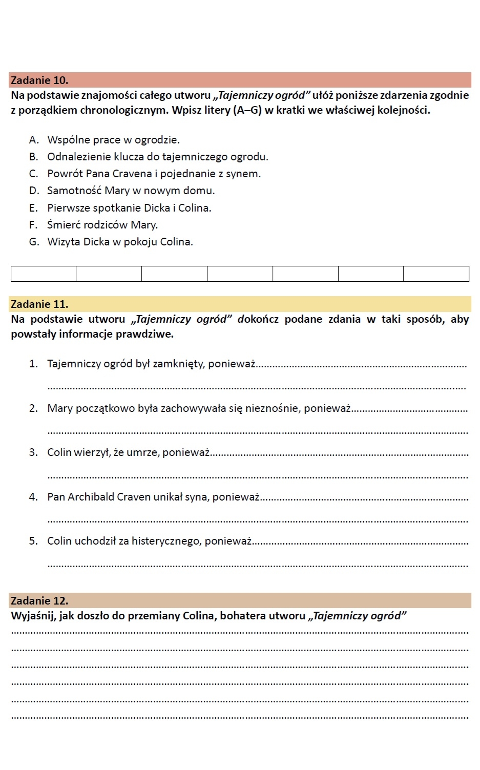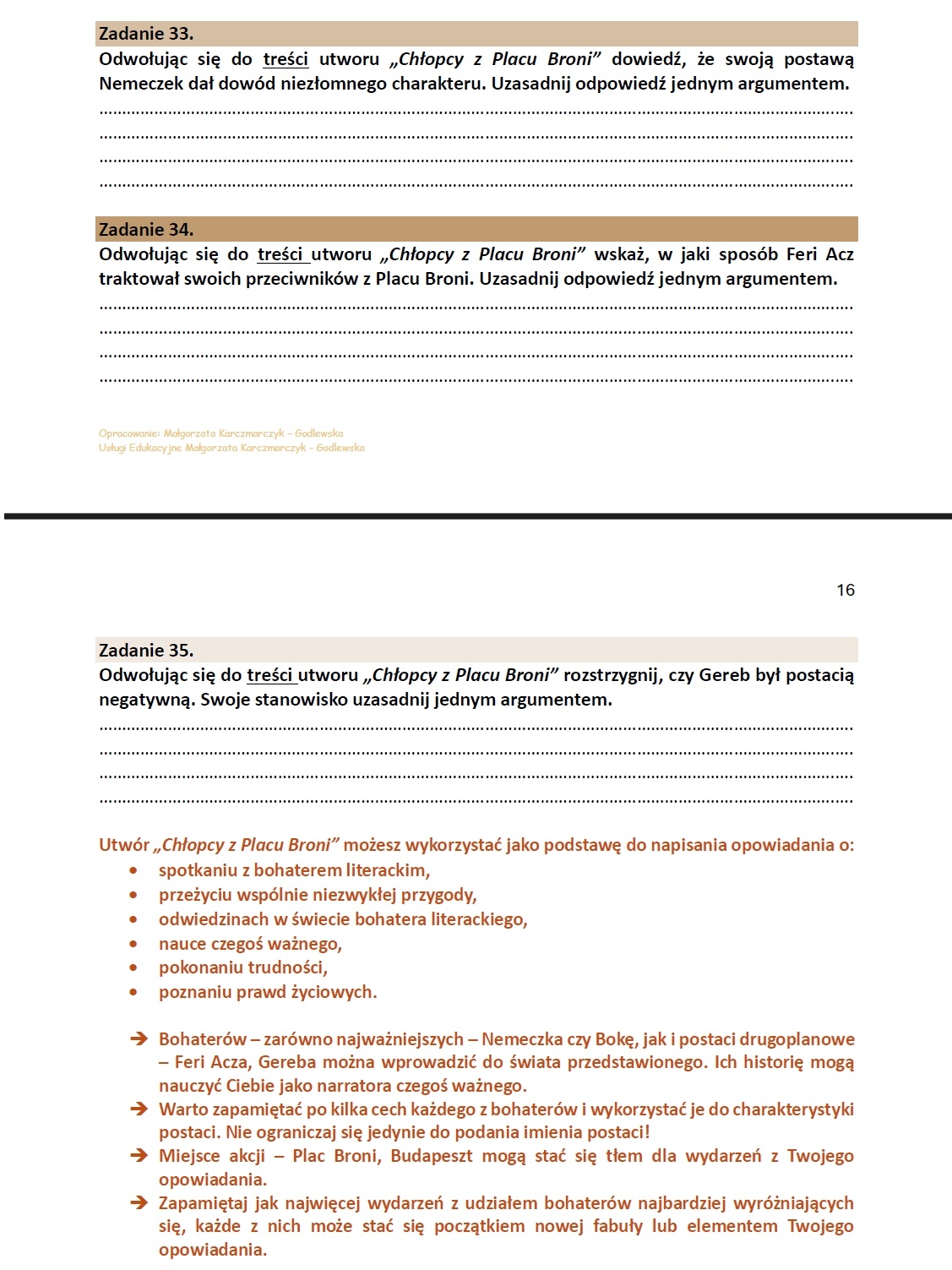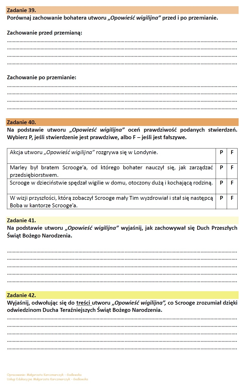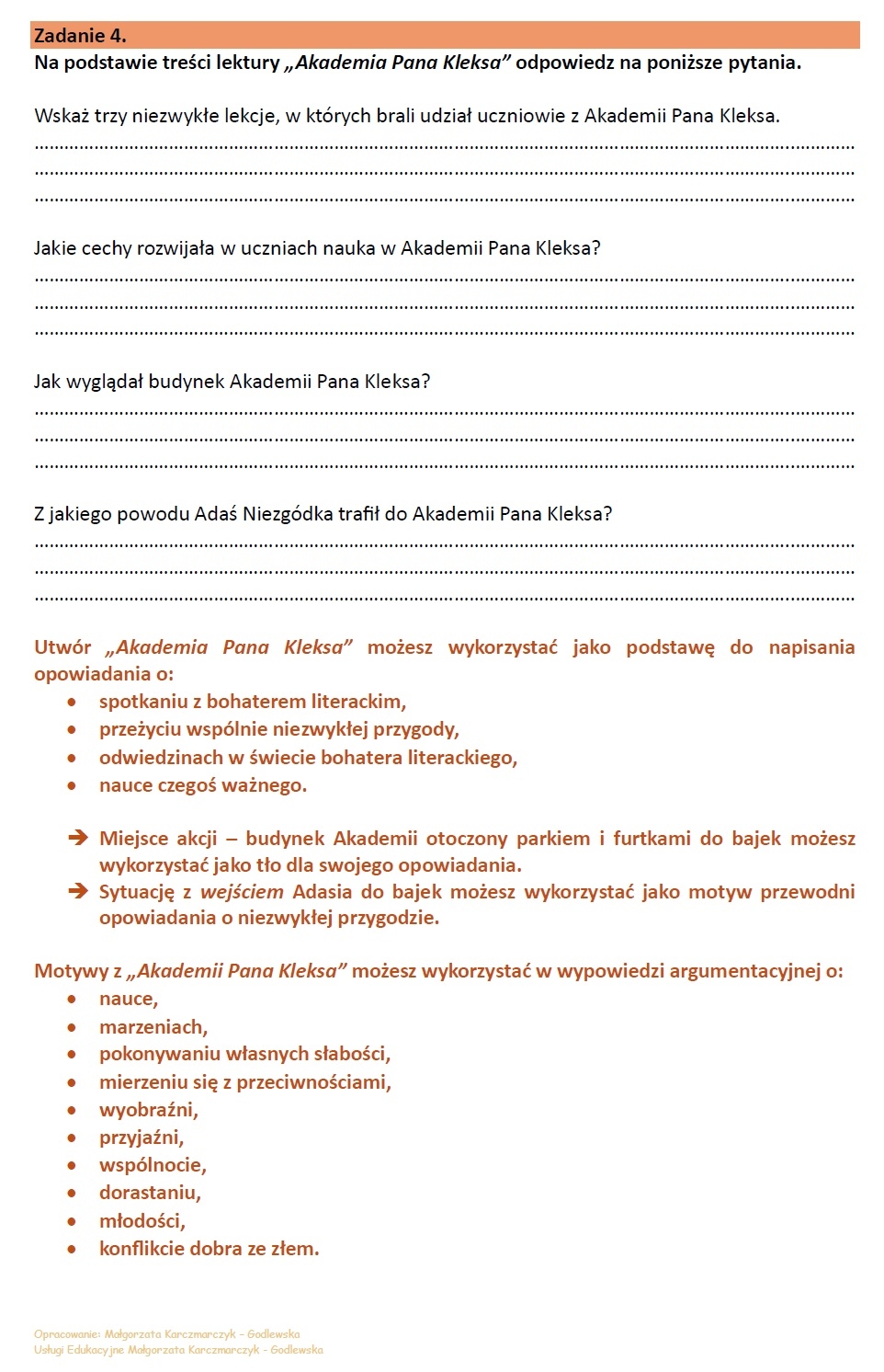 99 pytań z treści lektur. Zestaw 99 zadań z TREŚCI lektur z klas IV-VIII. Materiał oparty o lektury: Akademia Pana Kleksa, Kajko i Kokosz. Szkoła latania, Tajemniczy ogród, Opowieści z Narnii…, Hobbit…, Chłopcy z Placu Broni, Opowieść wigilijna, Zemsta, Kamienie na szaniec, Świtezianka, Dziady, cz. II, Reduta Ordona, Artysta, Mały Książę, Latarnik, Balladyna. Po każdej sekcji zadań podpowiedź dla uczniów, w jaki sposób wykorzystać lekturę w opowiadaniu lub wypowiedzi argumentacyjnej. Różnorodne zadania oparte o schematy egzaminacyjne i nie tylko: prawda/fałsz, wybór, uzupełnianie, uzasadnianie odpowiedzi, praca z fragmentem, analiza ilustracji – zadania, które rozwijają umiejętność czytania ze zrozumieniem, argumentowania, wnioskowania i uzasadniania. • Materiał w dwóch wersjach: pdf i word. • W zestawie odpowiedzi. • 46 stron zadań Materiał można wykorzystać jako element samodzielnej pracy, można wybierać pojedyncze zadania i urozmaicać nimi lekcje, można wykorzystać podczas lekcji poświęconych na utrwalenie/powtórzenie lektury. POLECAM