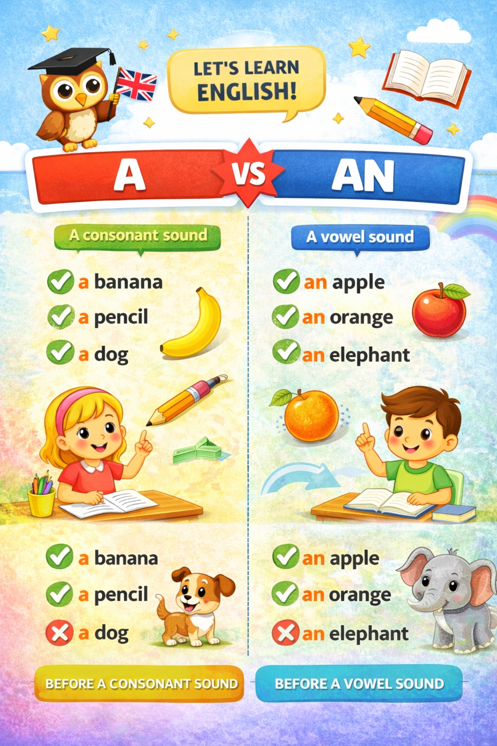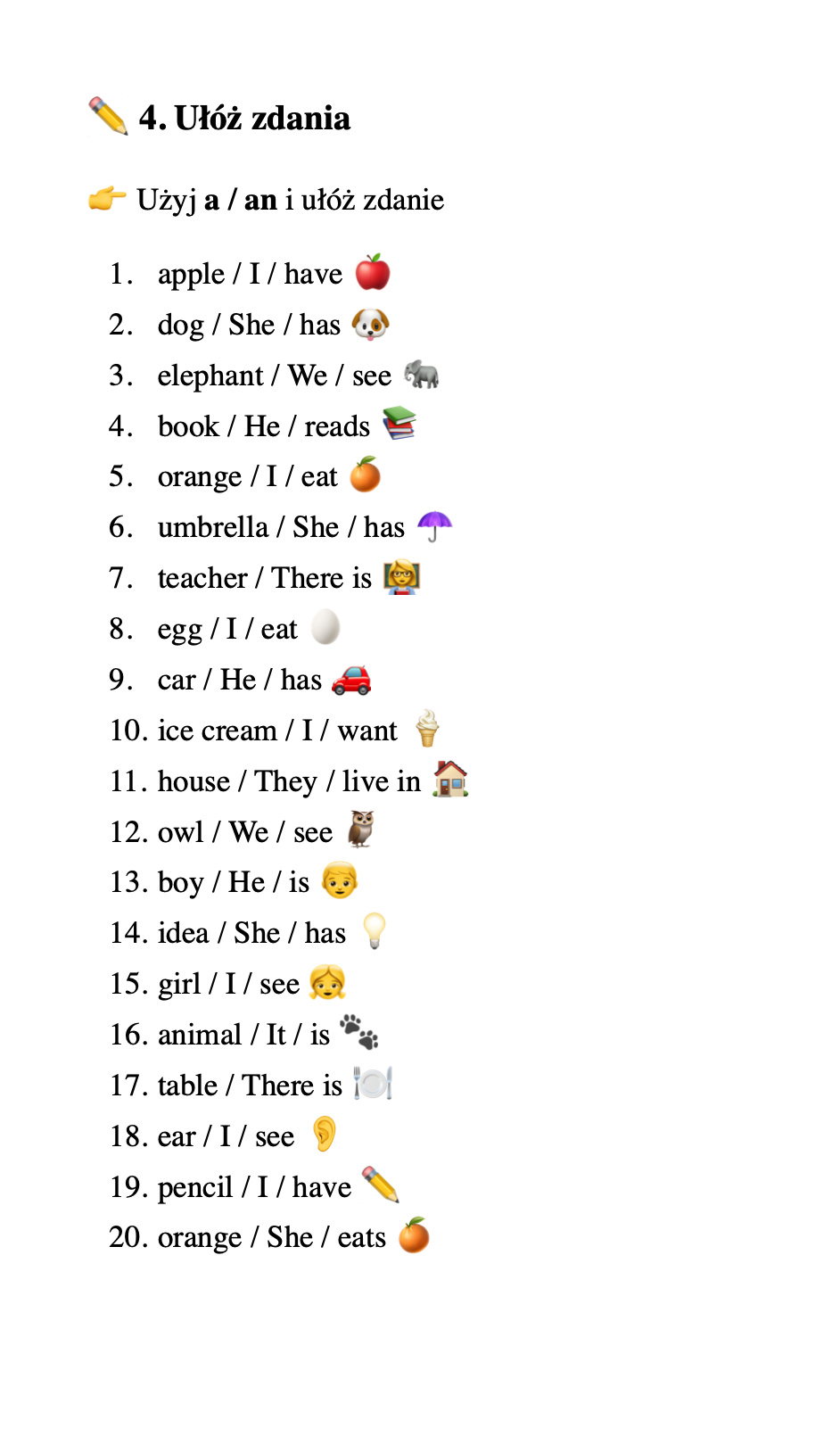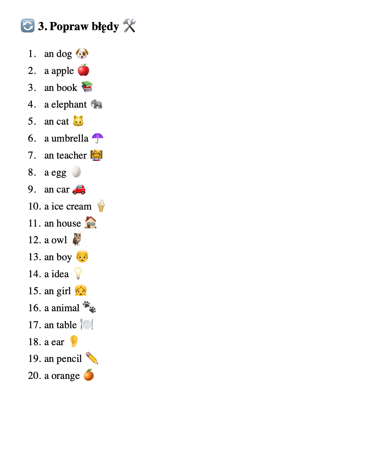 Karta pracy została przygotowana dla uczniów szkoły podstawowej i skupia się na utrwaleniu użycia przedimków a i an. Uczniowie uczą się rozróżniać, kiedy stosować każdą z form, na podstawie pierwszej głoski wyrazu.
