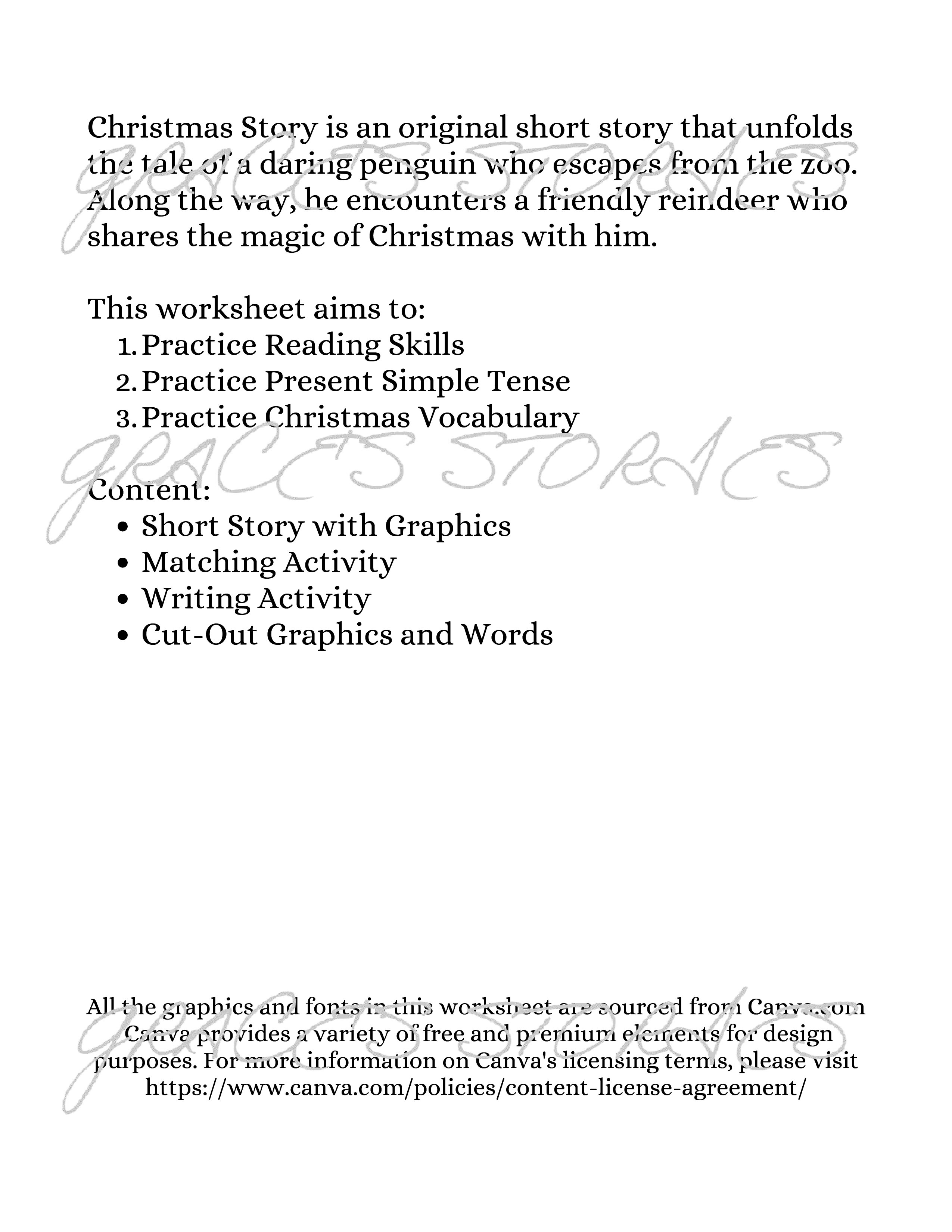 Christmas Story is an original short story that unfolds the tale of a daring penguin who escapes from the zoo. Along the way, he encounters a friendly reindeer who shares the magic of Christmas with him.