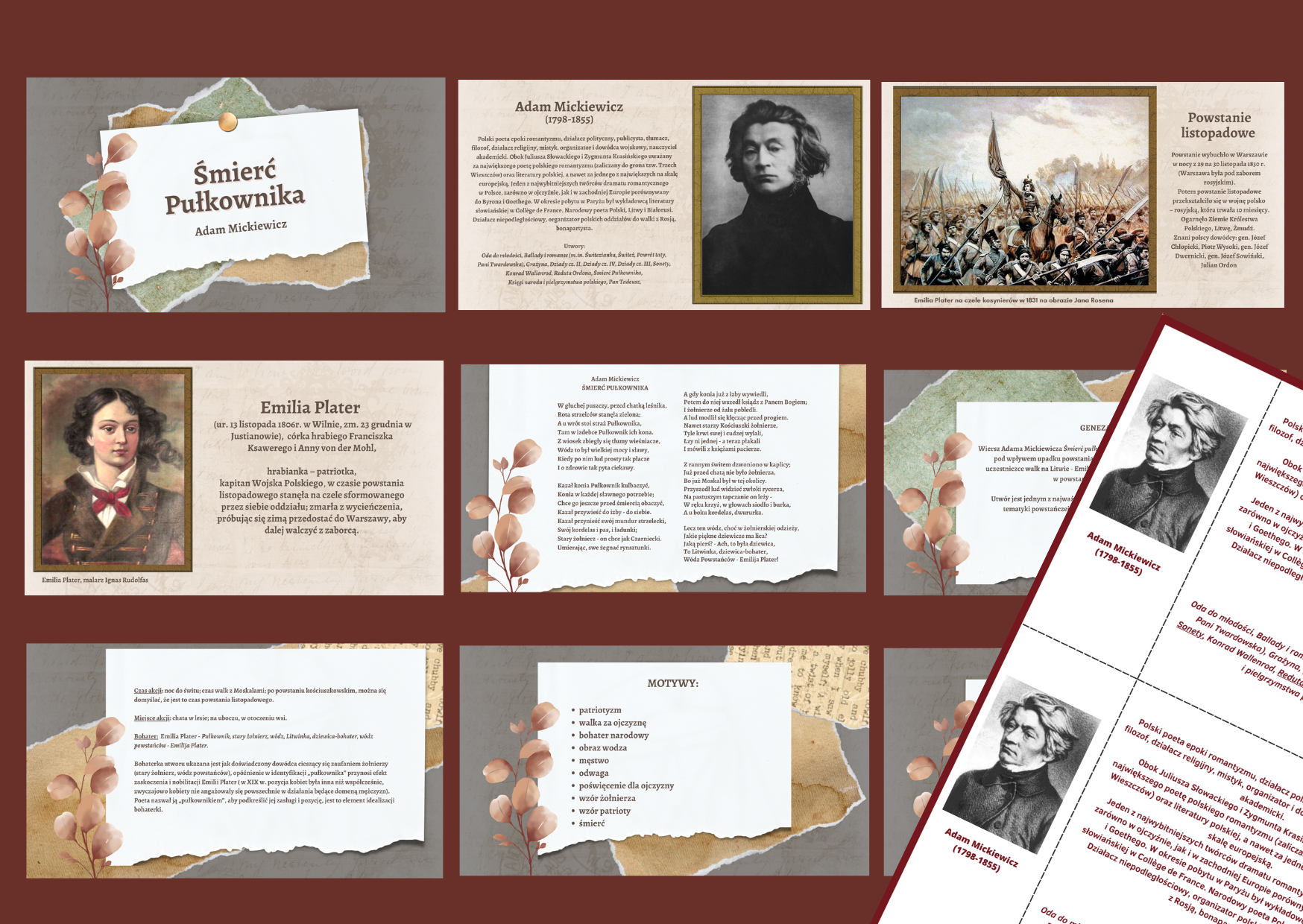 Zestaw na lekcję o “Śmierci Pułkownika" A. Mickiewicza, w skład którego wchodzą: prezentacja (14 slajdów: biogram poety, biogram Emilii Plater, geneza oraz omówienie treści i problematyki tekstu Mickiewicza, a także wklejka – biogram Mickiewicza.