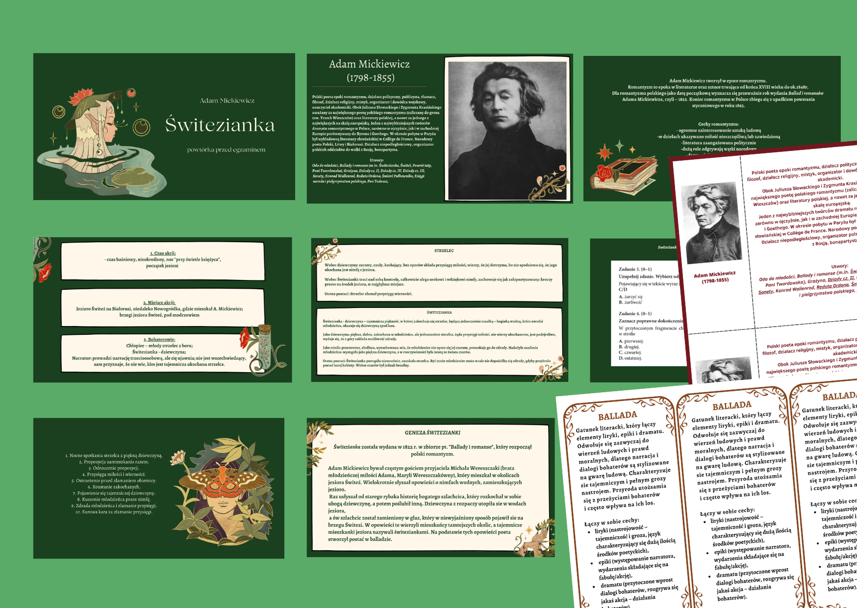Zestaw na lekcję o “Świteziance" A. Mickiewicza, w skład którego wchodzą: prezentacja (20 slajdów: biogram poety, informacje o balladzie jako gatunku literackim, geneza oraz omówienie treści i problematyki tekstu Mickiewicza oraz przykłady zadań egzaminacyjnych (CKE) związanych ze “Świtezianką", a także 2 wklejki – biogram Mickiewicza i ballada.