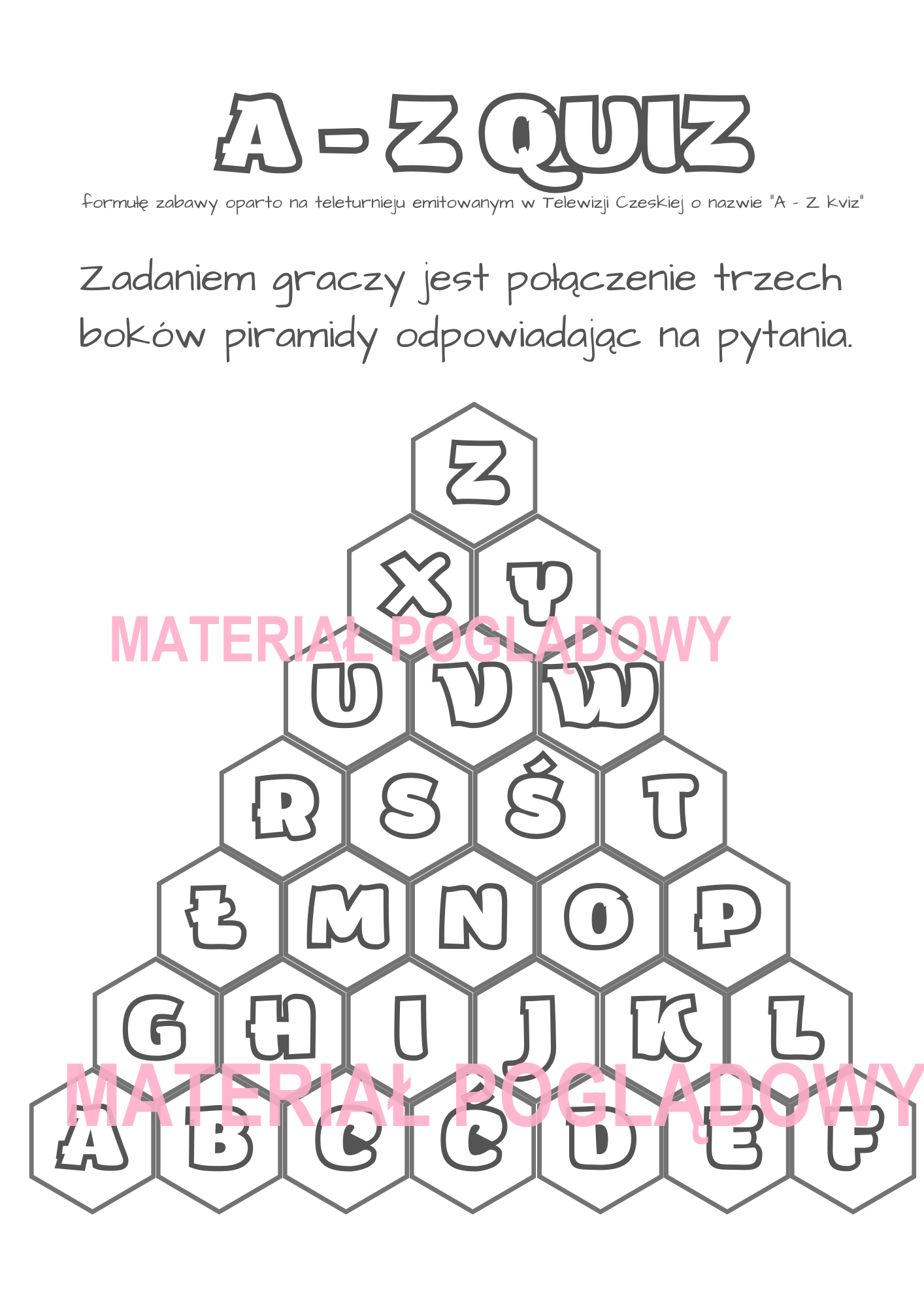 Powtórzenie wiadomości w formie quizu do pracy z całą klasą lub w grupach. Zestaw zawiera aż 54 pytania otwarte i zamknięte o zróżnicowanej tematyce (procenty). Zabawa oparta na czeskim teleturnieju “az kviz”. Zadaniem uczniów jest połączyć trzy boki piramidy swoim kolorem, odpowiadając na pytania. Szczegóły opisane w pliku.